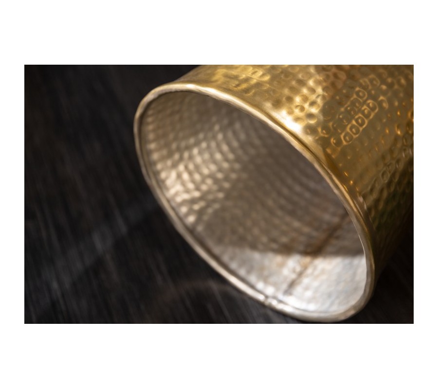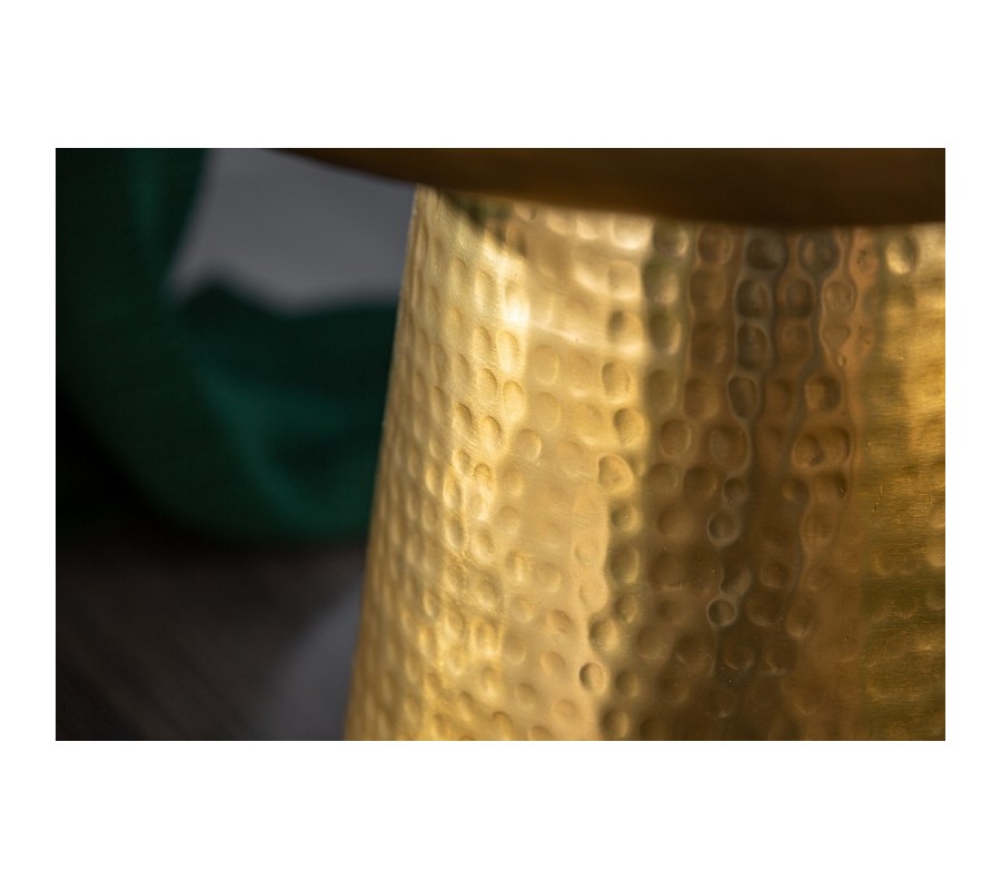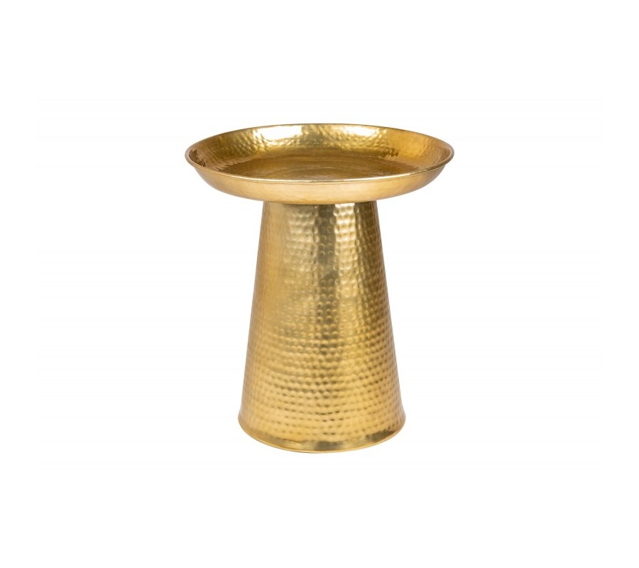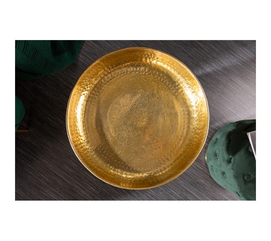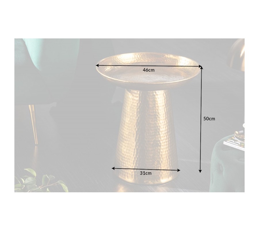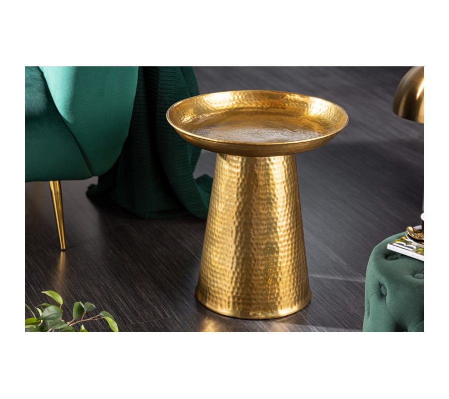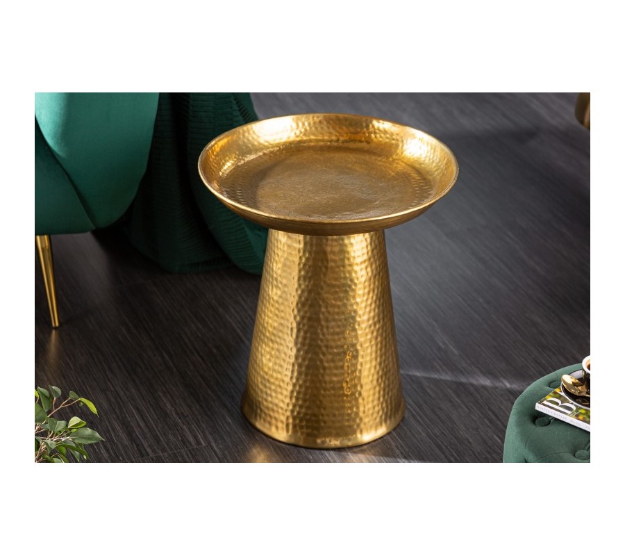 Jedinečný príručný stolík Hammerblow si získa každého milovníka orientálneho štýlu! Jeho zaujímavý dizajn je tvorený okrúhlym podstavcom a kruhovou zaoblenou vrchnou časťou, pričom celá konštrukcia je obohatená o štýlový reliéfny vzor, ktorý je dosiahnutý ručne pomocou kladivka, ktoré vytvorí dizajnové jamky. .Zlatá farba stolíka do vašej obývačky vnesie luxusný orientálny nádych a dá sa výborne kombinovať najmä v tmavších priestoroch. Vynikne napríklad v kombinácii s čalúnenou sedačkou v zelenej či modrej farbe a vďaka svojej zlatej farbe sa dá výborne kombinovať aj s doplnkami v orientálnom alebo art-deco štýle. Príručný stolík Hammerblow je skutočne originálnym kúskom, ktorý vašu obývačku obohatí o elegantný luxusný nádych!