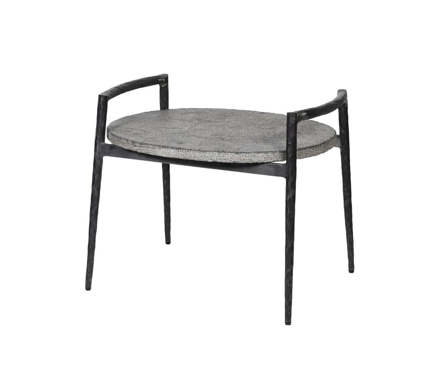 Industriálny príručný stolík Blue Stone Vás zaujme už pri prvom pohľade. Industriálny nádych dodáva príručnému stolíku sivá povrchová doska, ktorá je vyrobená z kameňa a čierne nahrubo opracované nohy vyrobené z kovového materiálu. Povrchová doska je obohatená štruktúrou, čím vytvára ilúziu neopracovaného kamenného materiálu. Oválny stolík bude Vašim funkčným pomocníkom a dodá Vášmu interiéru jedinečnú atmosféru. Stolík vynikne v neutrálnych aj farebných priestoroch a pri pohľade naň sa Vám spríjemní čas strávený v miestnosti. Stolík sa skvele hodí do domáceho priestoru, môže byť umiestnený napríklad aj vedľa kresla a taktiež sa hodí do kombinácie s konferenčným stolíkom Blue Stone. Stolík má aj praktické rukoväte pre jednoduchšiu manipuláciu pri prenášaní, ktoré sú dizajnovo prepojené s konštrukciou nožičiek. Dizajnérsky kus nábytku dokonale ladí s modernými štýlovými nábytkami.