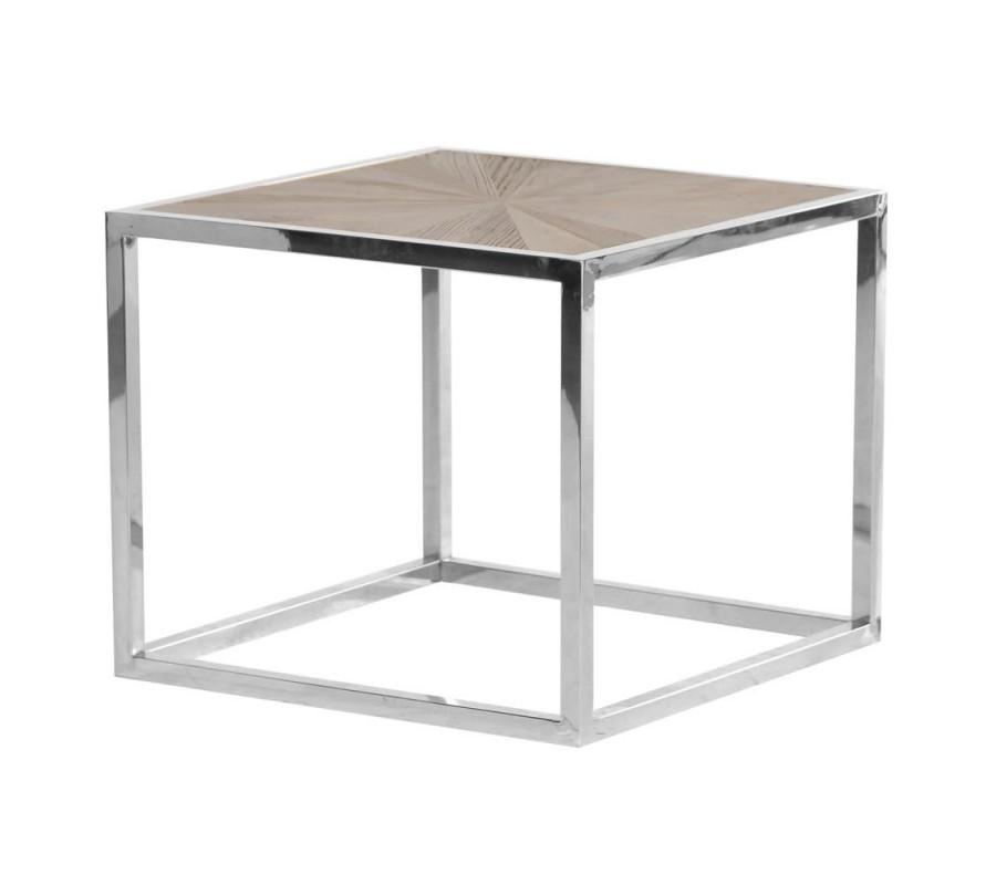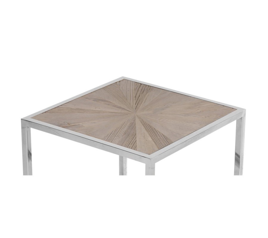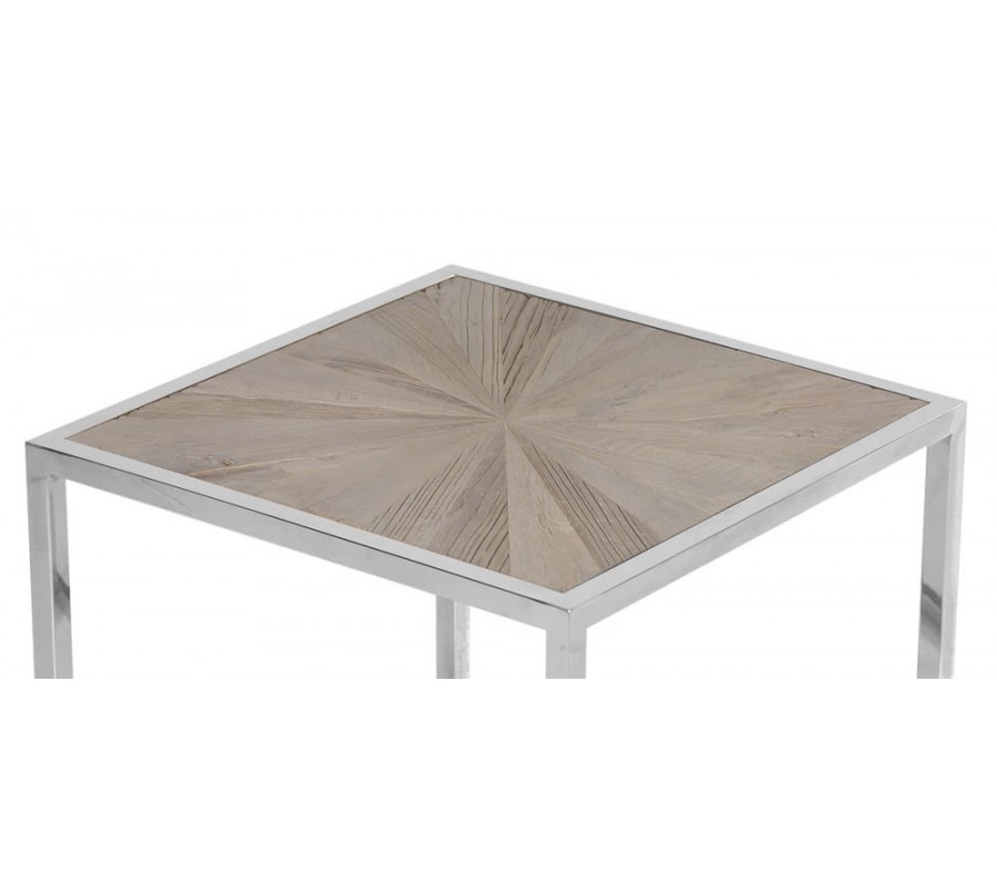 Moderný štvorcový príručný stolík Adelie z brestového dreva so striebornou kovovou konštrukciou 60cm