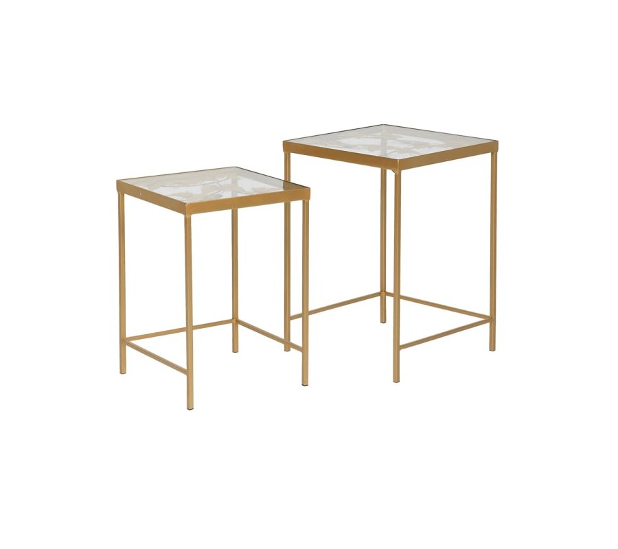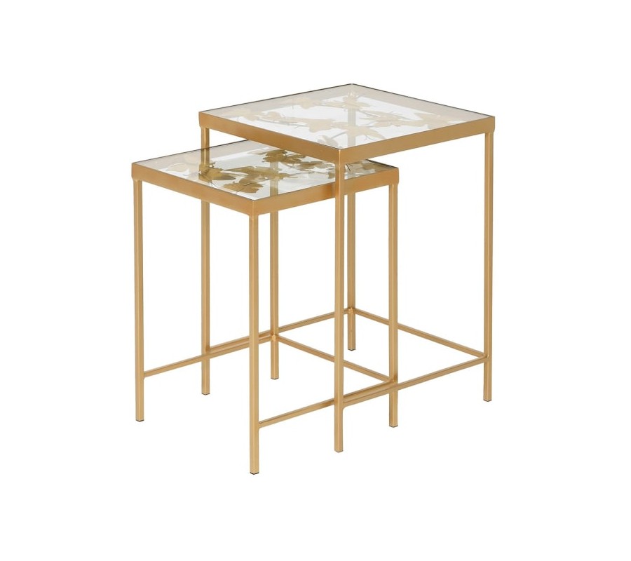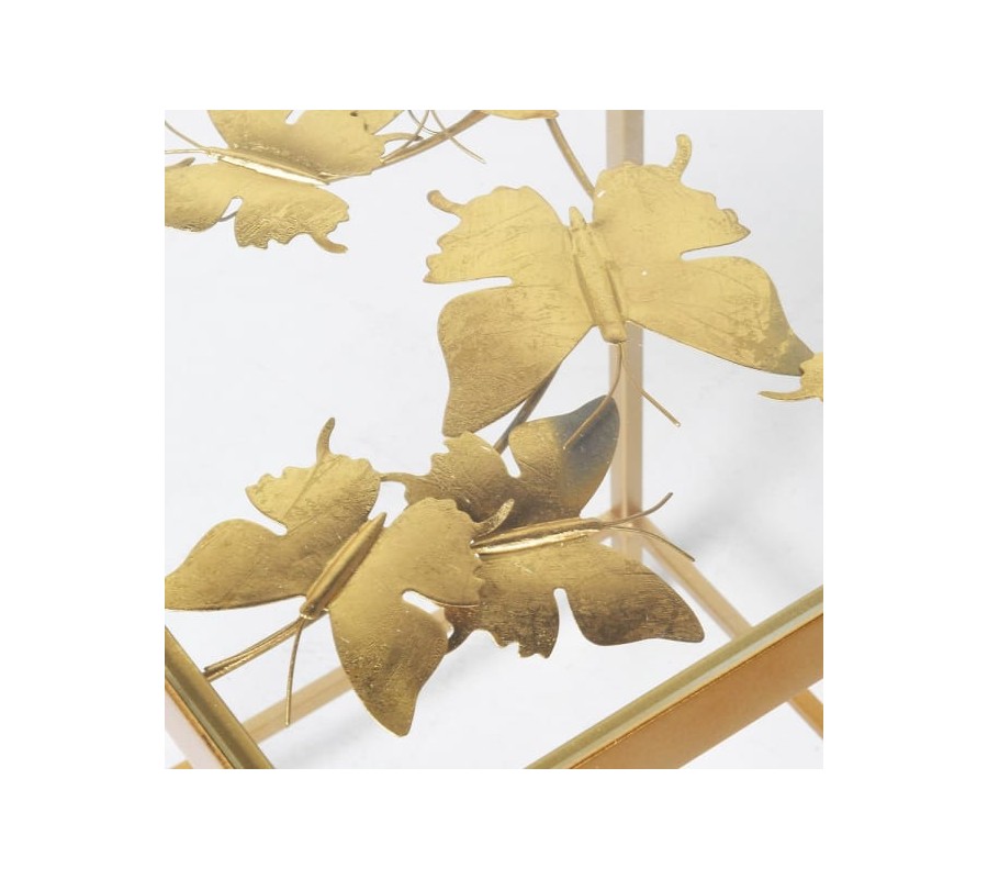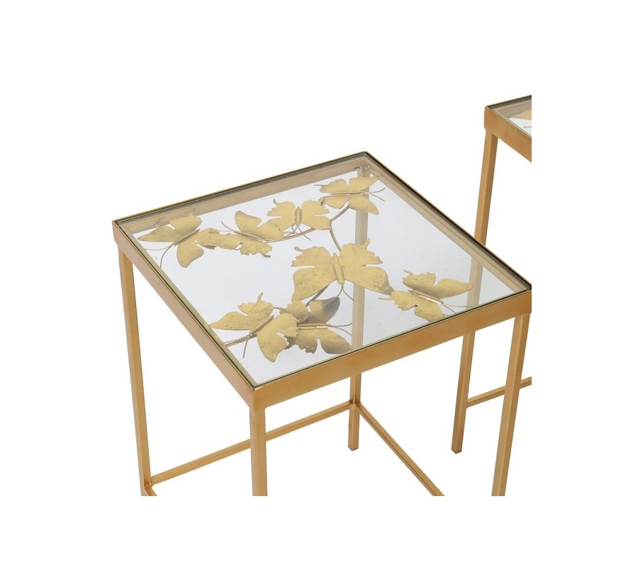 Štýlový set dvoch príručných stolíkov Papillon krásne doplní každý moderný či art-deco ladený interiér. Stolíky sa vyznačujú svojou eleganciou a jemným prevedením v zlatej farbe. Konštrukcia vyrobená z kovu tvorí nadčasovú kombináciu so štvorcovými sklenenými povrchovými doskami. Sklo je zdobené jemnou dekoráciou v podobe zlatých motýlích vzorov, čím stolíky dostávajú jedinečný nádych štýlu art-deco. Vďaka vzudšnému dizajnu stolíky môžu pomôcť opticky zväčšiť vaše priestory. Set Papillon odporúčame doladiť do moderných obývačiek ladených v tmavších výrazných tónoch so zlatými akcentami.
