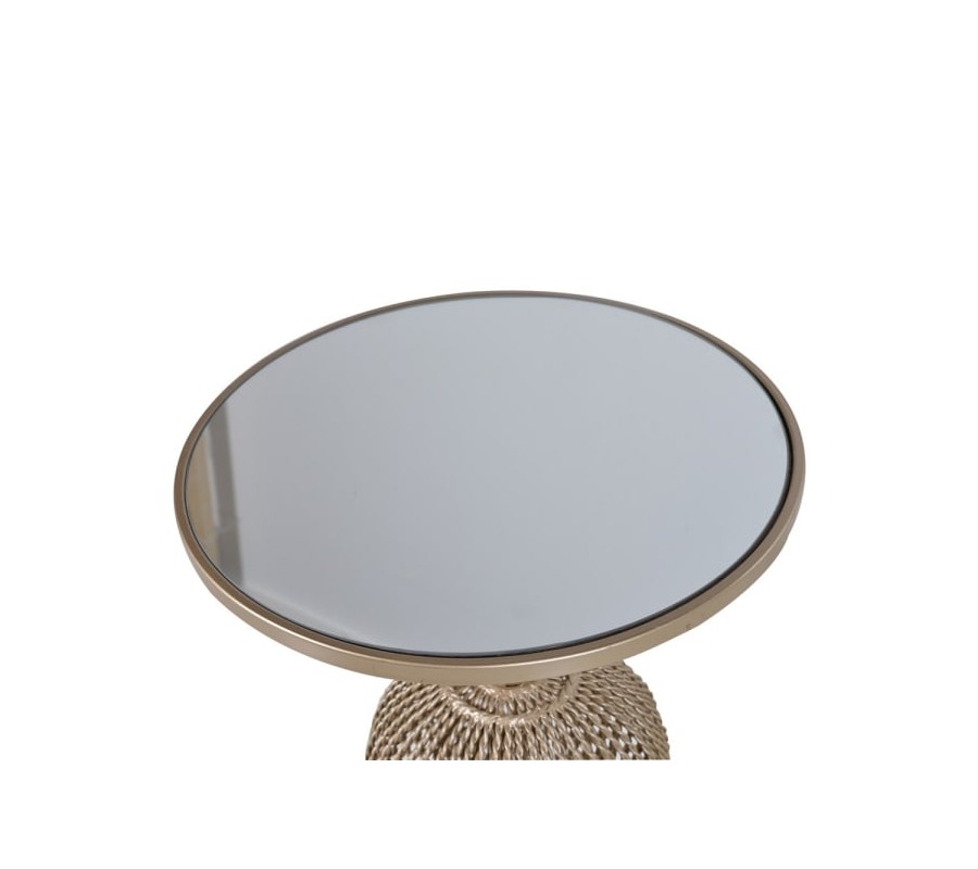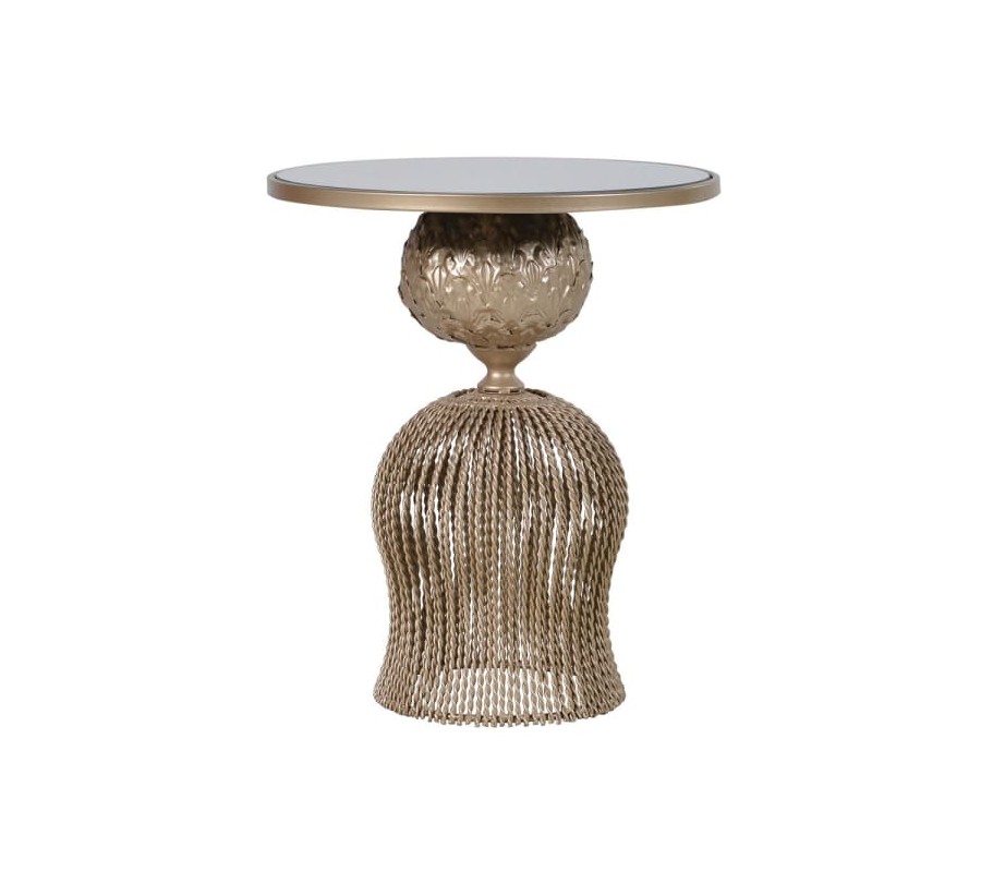 Dizajnový príručný stolík Perila je špecifický najmä svojím jedinečným prevedením a dizjanom. Už na prvý pohľad zaujme vďaka štýlovej konštrukcii z kovu oblých tvarov, pričom spodná časť pripomína dizajn zapletených vlákien či povrázkov. Vrchná guľatá časť podstavy disponuje florálnym zdobením. Celá podstava sa nesie v lusuxnej zlatej farbe a elegantne ju dopĺňa okrúhla povrchová doska zo skla. Táto kombinácia pripomína populárny art-deco štýl, ktorý krásne zapadne do všetkých moderne ladených priestorov. Príručný stolík Perila odporúčame kombinovať s výraznými farbami a kúskami ako je napríklad zamatová čalúnená sedačka, sklenený konferenčný stolík či iný kovový alebo zrkadlový nábytok.