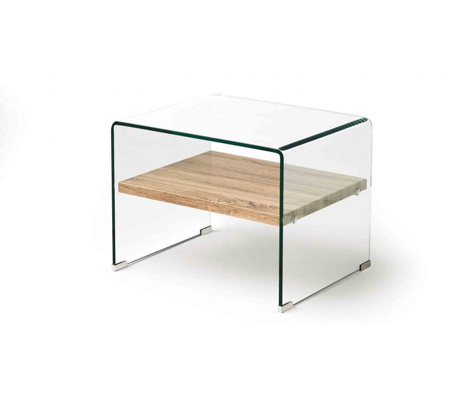 Štýlový príručný stolík Alize je dizajnovým prepojením nadčasového vzhľadu a elegancie čistých línií. Zaujme najmä milovníkov moderného minimalistického dizajnu, a to vďaka svojej jednoduchej konštrukcii z číreho skla, ktorú dopĺňa prírodná drevená doska v naturálnej hnedej farbe slúžiaca ako polička. Vzdušný dizajn pomôže opticky zväčšiť priestory vašej obývačky či spálne a zároveň vďaka univerzálnej farebnosti nebudete mať problém s umiestnením do rôznofarebne ladených miestností. Kombinácia skla a dreva pôsobí elegantne a tento jedinečný súlad farieb a štruktúr oživí každý moderný interiér. Pre dosiahnutie dokonalého nadčasového vzhľadu odporúčame kombináciu s dreveným nábytkom či doplnkami zo skla.
