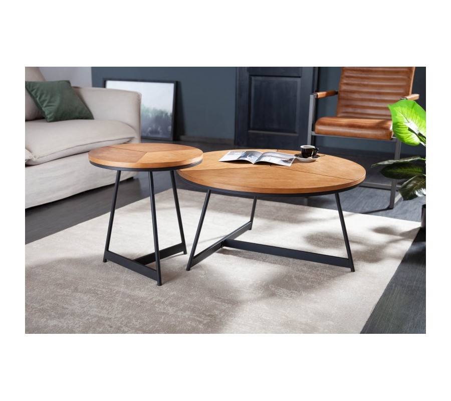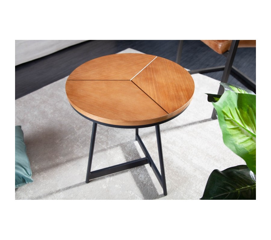 Industriálny nadčasový okrúhly príručnýstolík Carvallo s vrchnou doskou s dubovým vzhľadom 45cm