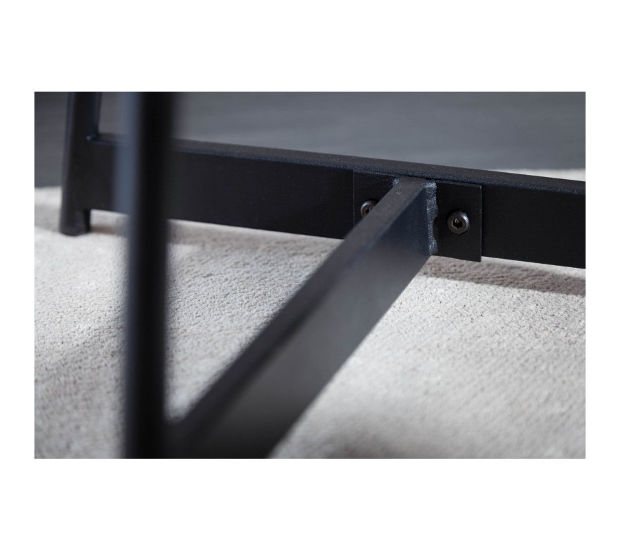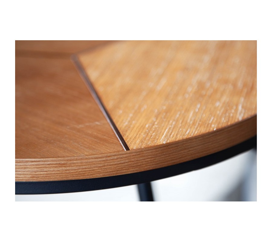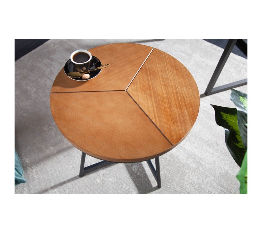Okrúhly príručný stolík s názvom Carvallo je zaujímavým dizajnovým kúskom s ktorým si môžete dokrášliť váš moderne zariadený interiér. Tri vyrezávané línie na vrchnej doske v prírodnom hnedom vyhotovení rozdelia okrúhly vrch na tri samostatné časti. Vrchná doska je následne vložená do troch čiernych kovových nožičiek, ktoré sú na svojej spodnej časti spojené v tvare písmena T. Vďaka kombinácií čiernej kovovej podstavy a moderne spracovaného dreva sa príručný stolík Trigono ľahko kombinuje v industriálne zariadených interiéroch, alebo aj v moderných interiéroch s čiernymi kovovými prvkami, pri ktorých vynikne vrchná doska stolíka.