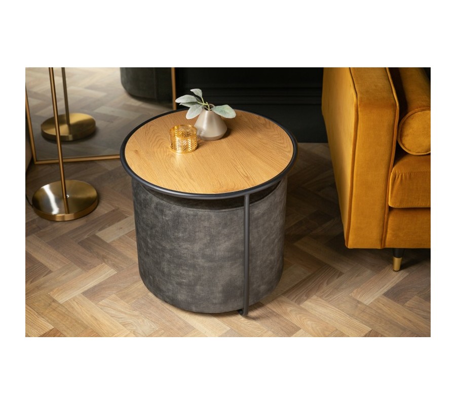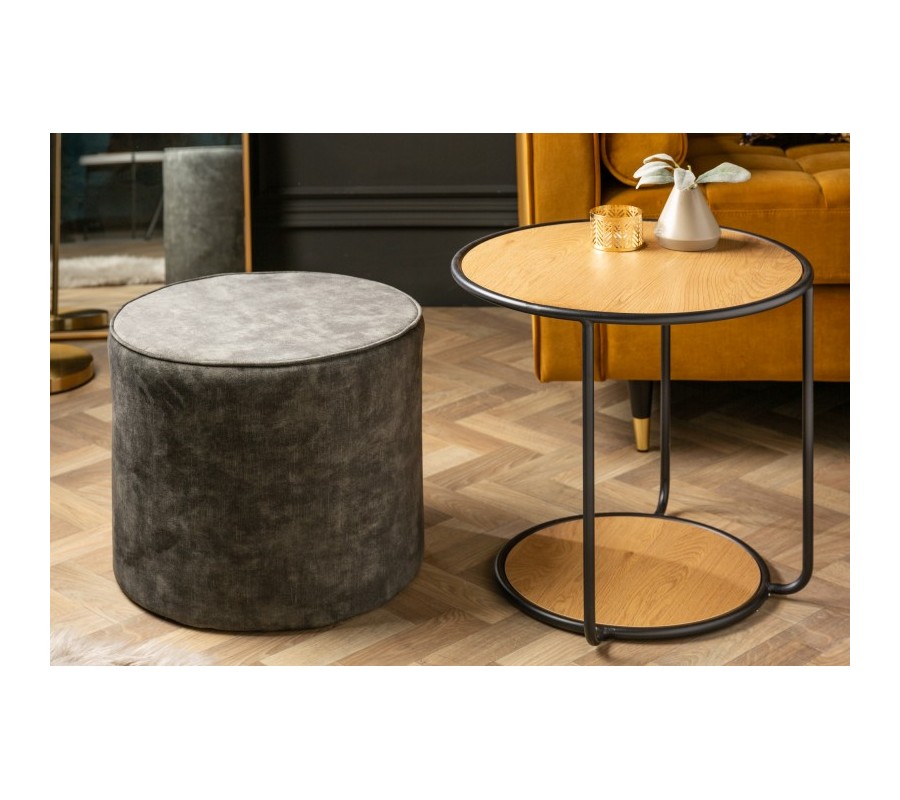 Dizajnový set Taller vás zaujme svojou atypickou kombináciou industriálneho príručného stolíka a modernou taburetkou. Drevený príručný stolík disponuje otvorenou podstavou, ktorá slúži ako priestor či už pre sivú zamatovo čalúnenú taburetku, alebo pre odklad vašich vecí. Podstavu a vrchnú dosku príručného stolíka Taller spájajú tri čierne kovové tyče, ktoré vytvárajú moderný, industriálny vzhľad stolíka. Vďaka svojej unikátnej kombinácií modernej taburetky a industriálneho príručného stolíka sa dizajnový set Taller vynikajúco kombinuje napríklad vo svetlých moderných obývačkách, v kombinácií so sivou sedačkou, alebo v tmavých industriálne zariadených interiéroch.