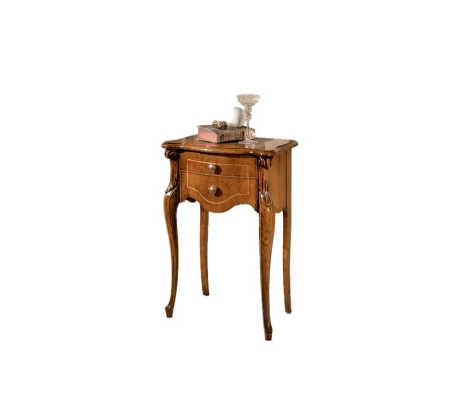 Luxusný príručný stolík z našej kolekcie talianskeho nábytku Pasiones zaujme predovšetkým milovníkov klasického a rustikálneho štýlu. Vyznačuje sa svojím elegantným prevedením z masívneho dreva a jemnými zaoblenými líniami, ktoré dopĺňa precízne ručné vyrezávanie a vkusné ornamentálne zdobenie. Stolík poskytuje úložný priestor v podobe dvoch menších zásuviek, ktoré výborne poslúžia pri umiestnení v obývačke, ale i na chodbe či vo vstupnej hale. Na výber ponúkame viacero možných farebných prevedení dreva aj kovových úchytov, vďaka čomu máte možnosť vytvoriť si skutočne jedinečný a originálny kúsok vhodný do vášho interiéru. Odporúčame stolík Pasiones kombinovať s masívnym nábytkom a čalúnenou sedačkou či stoličkami. Vynikne najmä v klasicky a rustikálne ladených priestoroch.