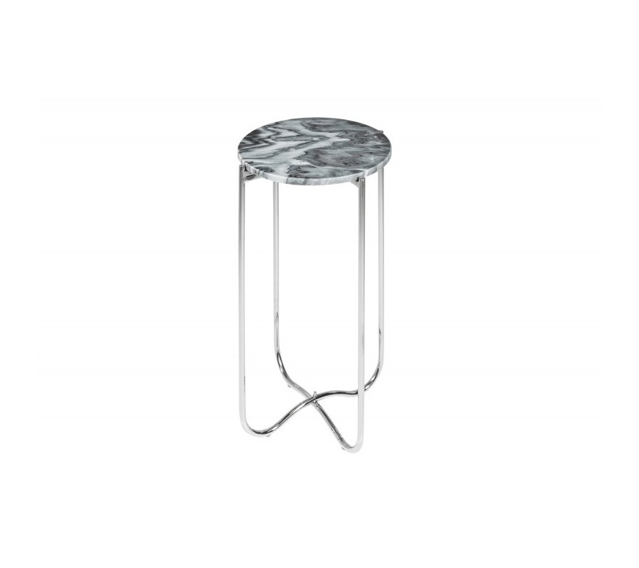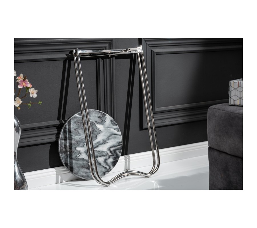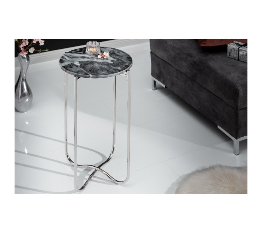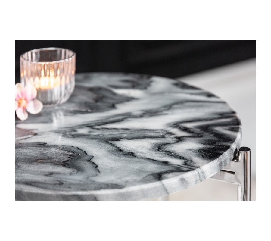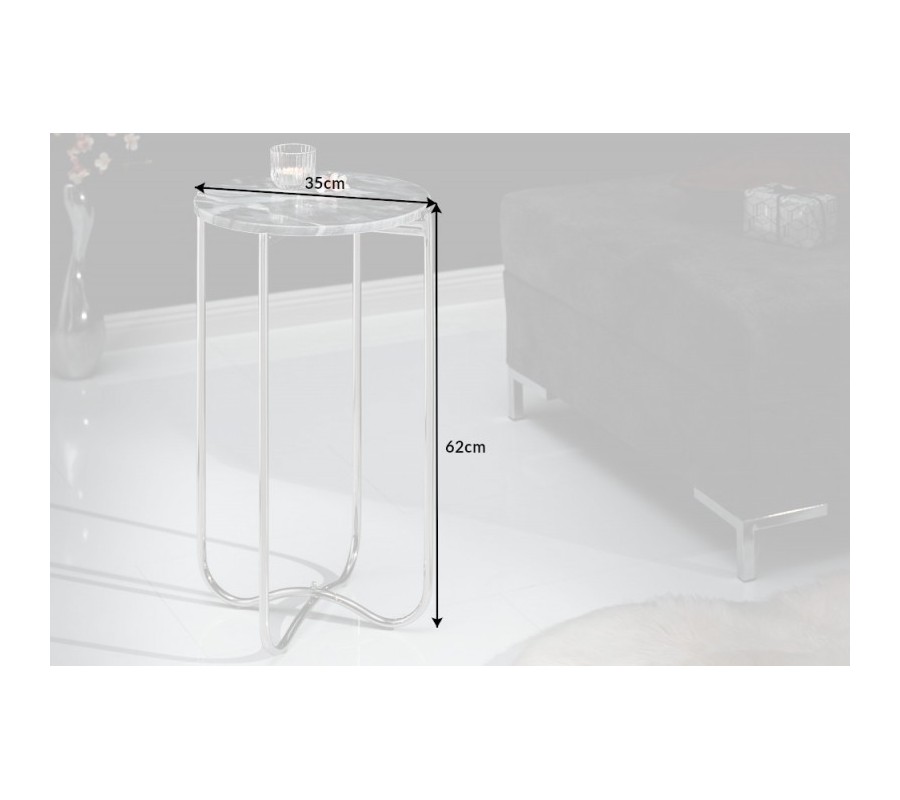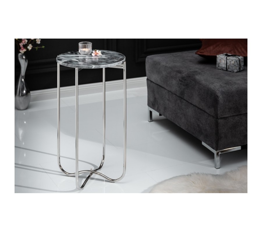 Art-deco strieborný okrúhly príručný stolík Noble s mramorovou povrchovou doskou a kovovou konštrukciou 35cm