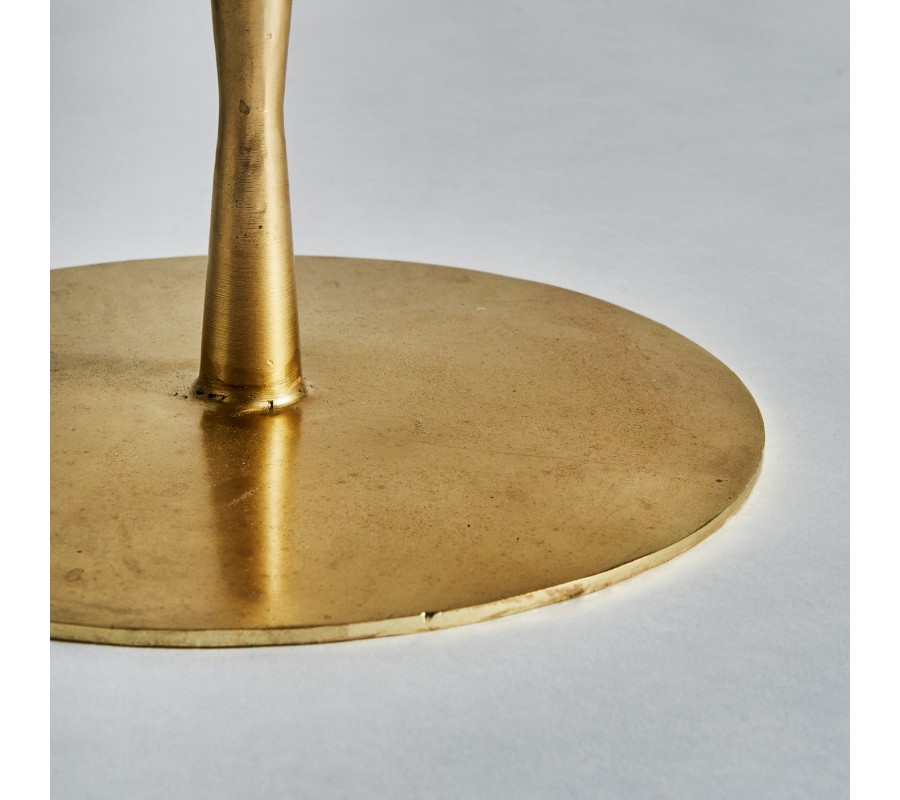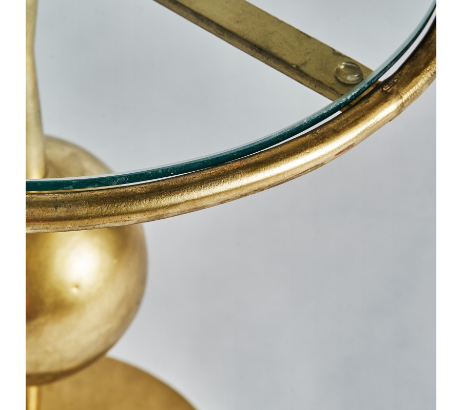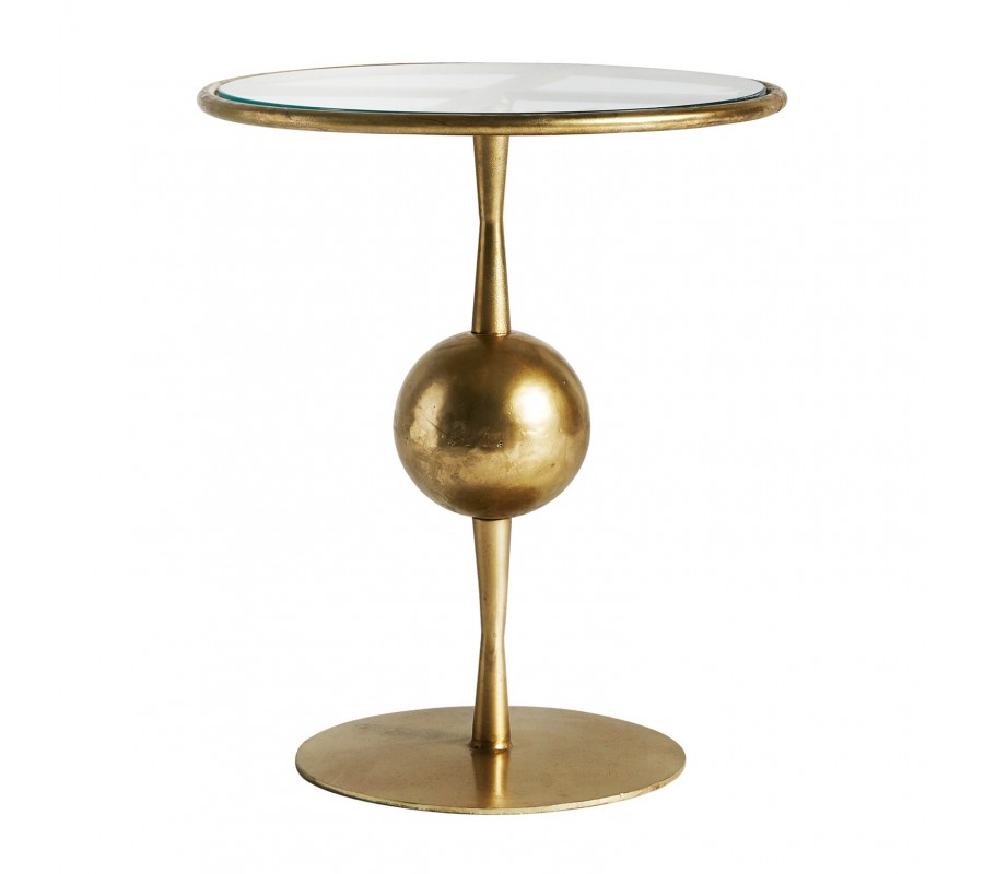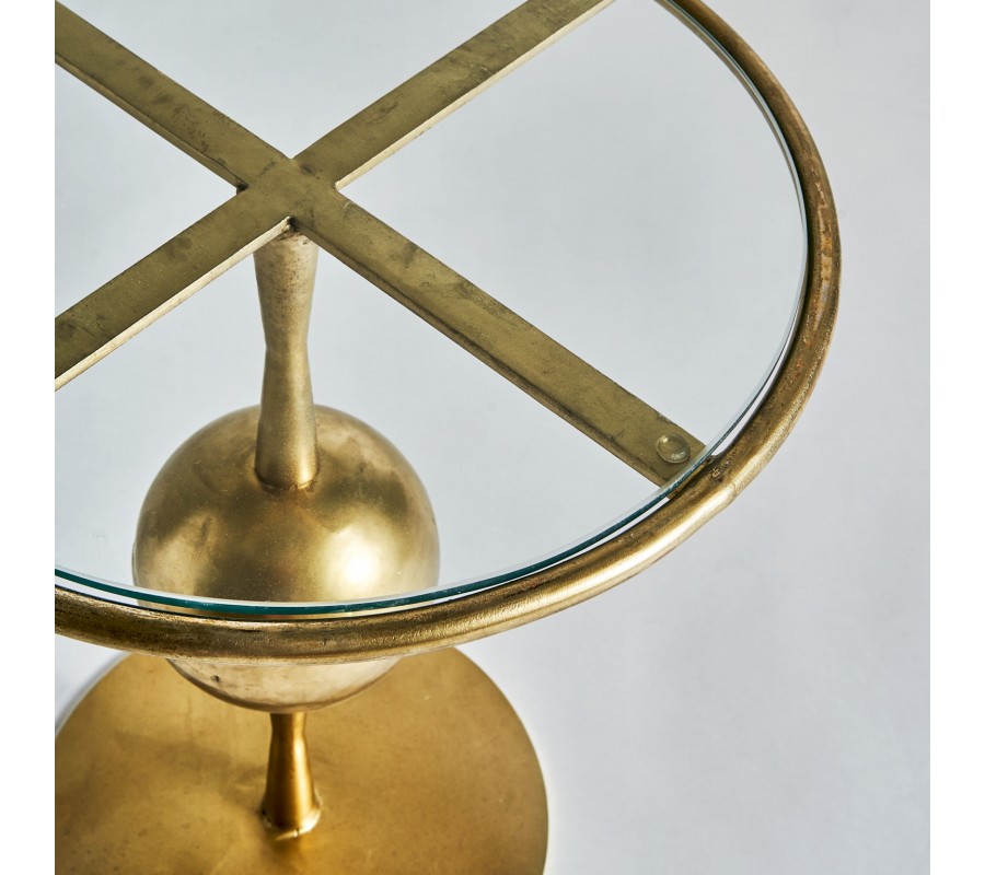 Art-deco dizajnový okrúhly príručný stolík Terrie do obývačky z kovu v zlatej farbe so sklenenou povrchovou doskou 46cm