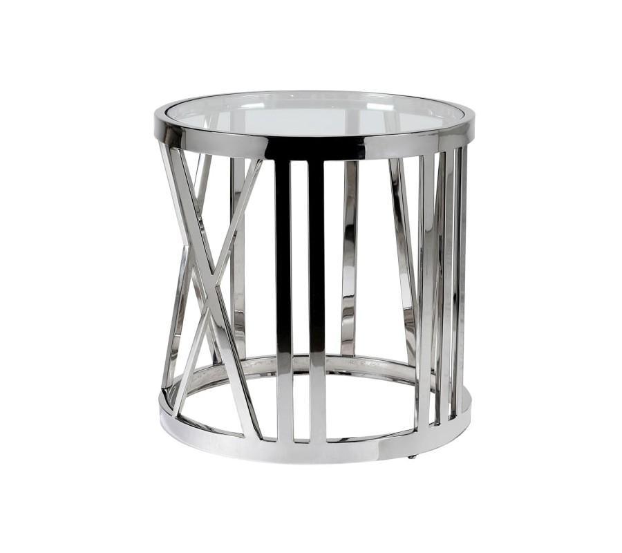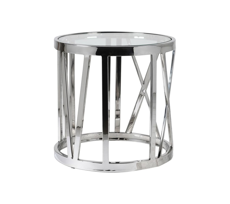 Chrómový art-deco príručný stolík Obey kruhového tvaru s kovovou konštrukciou s povrchovou doskou zo skla 55cm