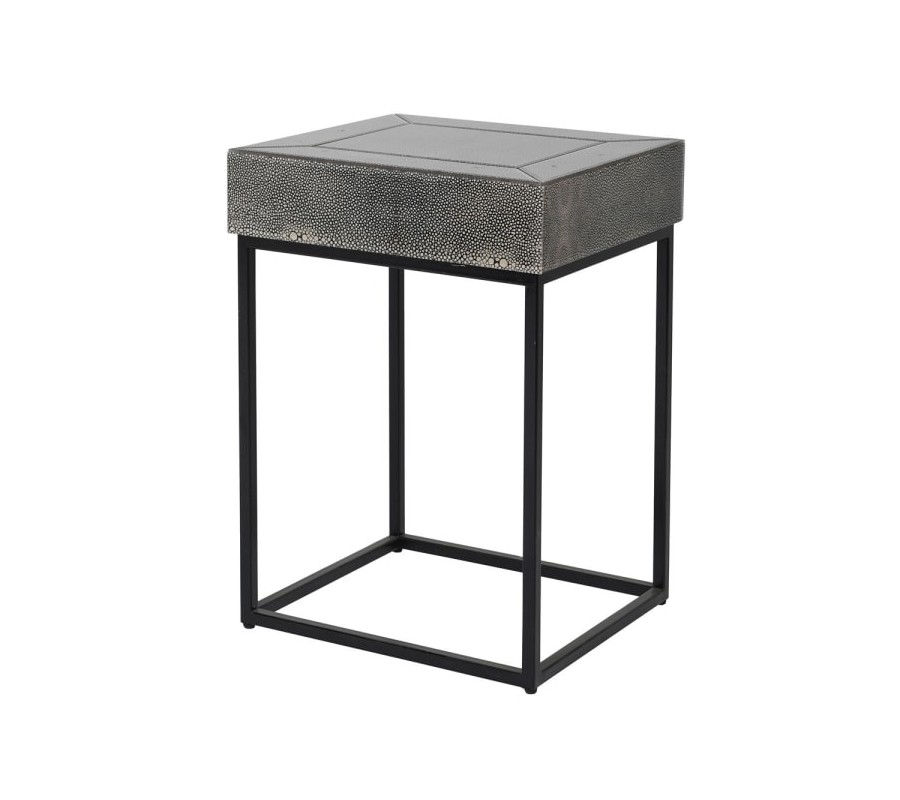 Dizajnový príručný stolík Shagreen sa vyznačuje svojím nadčasovým dizajnom a univerzálnou farebnosťou. Je vhodným na doplnenie industriálne ladených obývačiek, pracovní alebo predsiení, a možno ho taktiež využiť v spálni ako nočný stolík. Konštrukcia stolíku Shagreen pozostáva zo sivej povrchovej dosky pokrytej šagrénovou kožou a čiernej kovovej podstavy. Jemná bublinkovitá štruktúra typická pre šagrénovú kožu na povrchovej doske vytvára zaujímavý dizajn ozvláštňujúci celkový vzhľad tohto kúsku. Kovová konštrukcia dotvára industriálny vzhľad, ktorý osvieži aj moderne ladené priestory. Príručný stolík Shagreen vynikne v kombinácii s tmavým nábytkom z masívu a kovu a dá sa vhodne doplniť minimalistickými dekoráciami.