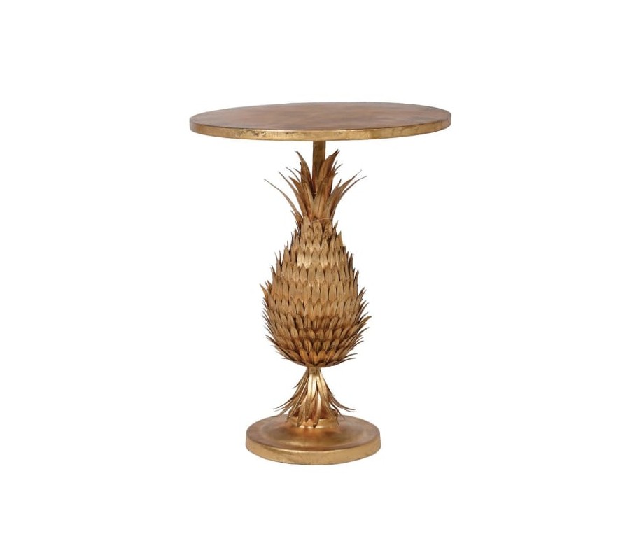 Dizajnový príručný stolík Pineapple predstavuje nevšedný interiérový doplnok vhodný predovšetkým do moderne a art-deco ladených priestorov. Zaujme svojou jedinečnou konštrukciou v tvare ananása, ktorá svojím hravým dizajnom upúta pozornosť nejedného vášho návštevníka. Podstava je doplnená kruhovou povrchovou doskou. Celý stolík je vyrobený z kovu a nesie sa v žiarivej zlatej farbe, čo vytvára jemný nádych art-deco štýlu. Príručný stôl Pineapple vynikne v štýlových obývačkách či jedálňach, rovnako ako aj v alternatívne ladených priestorov hotelov či barov.