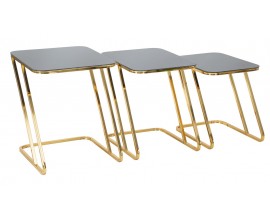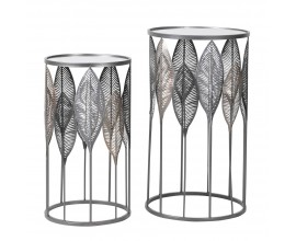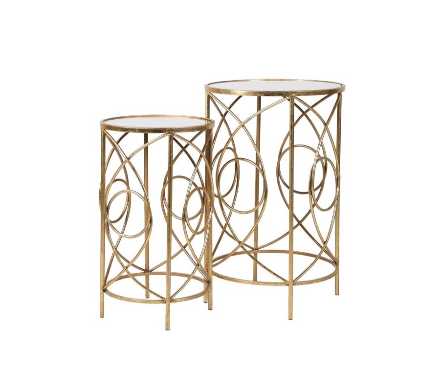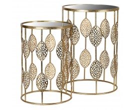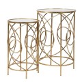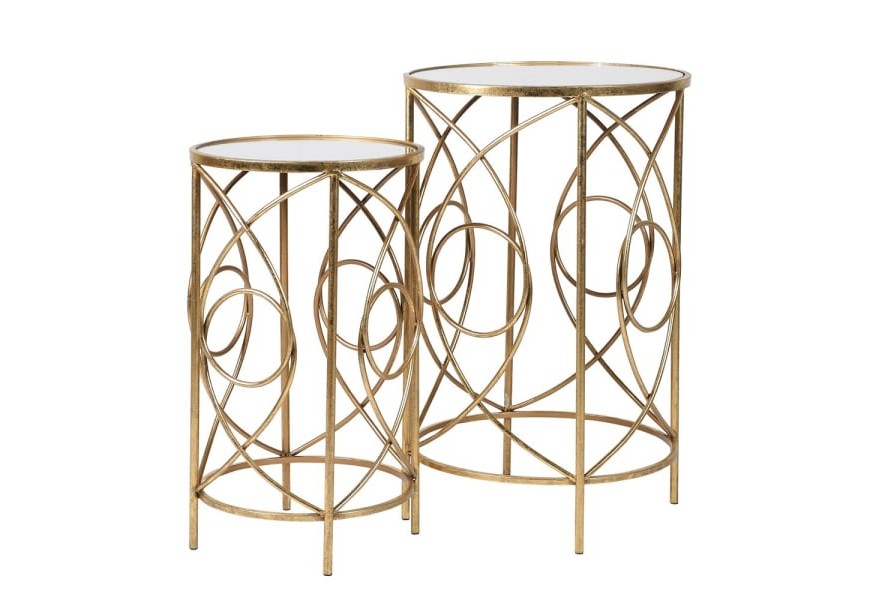 Štýlový set dvoch príručných stolíkov Satordi sa vyznačuje svojím elegantným dizajnom v žiarivej zlatej farbe. Tieto unikátne dizajnové kúsky spríjemnia priestory každého art-deco ladeného interiéru, a to predovšetkým vďaka svojmu vkusnému geometrickému zdobeniu v podobe kruhových vzorov. Do kovovej konštrukcie je osadená okrúhla sklenená povrchová doska so zrkadlovým efektom, ktorá dotvára elegantný art-deco vzhľad. Vďaka svojmu nadčasovému vzdušnému dizajnu tieto stolíky dopomôžu k optickému zväčšeniu vašich priestorov, a sú tak vhodnými kandidátmi aj na doplnenie menších obývačiek, nevyužitých chodbových priestorov či vstupných hál. Set príručných stolíkov Satordi krásne vynikne aj v opulentne ladených hoteloch či lobby baroch.