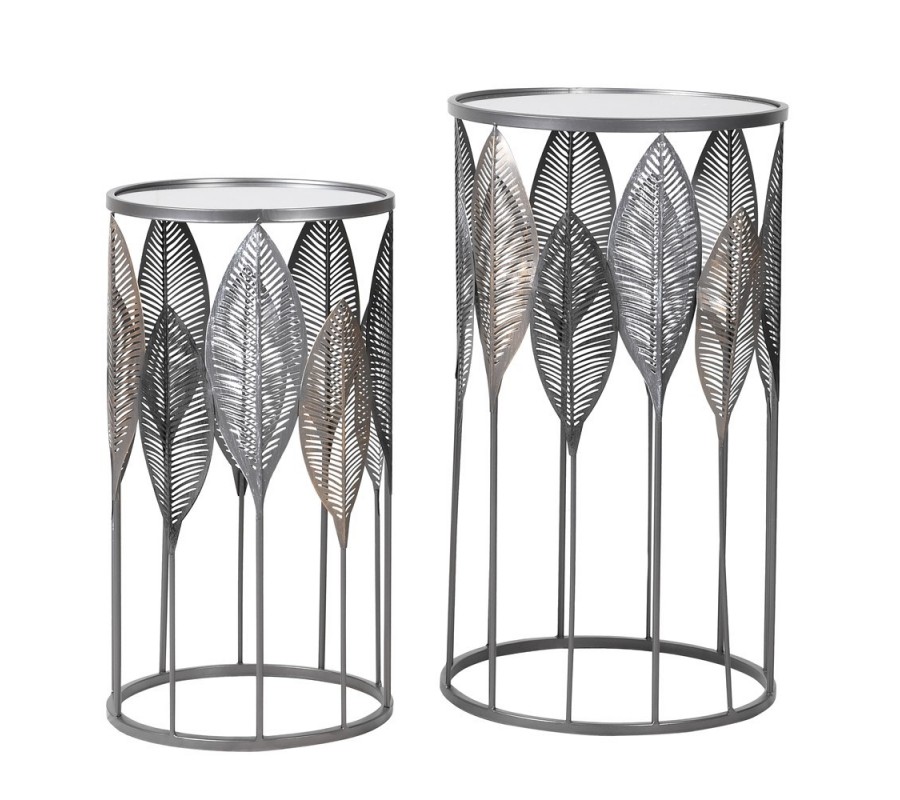 Dizajnový a nadčasový set dvoch okrúhlych stolíkov Satordi je vyrobený s dôrazom na svoje kovové telo, ktoré je rovnomerne zdobené priamimi úzkymi listami tmavej sivej, striebornej a zlatej farby. Set stolíkov Satordi sa pýši minimalistickou stavbou tela, ktorá dovoľuje vyniknúť zdobiacim prvkom a sklenenej povrchovej doske. Každý z dekoračných listov stolíkov Satordi je zasadený na vertikálnej kovovej línii striebornej farby totožnej s telom stolíka. Set stolíkov vám poslúži nielen ako odkladací priestor pri pohovke, no i ako rozširenie priestoru pri konferenčnom stole na pohostenie návštevy. Vkusný set odporúčame kombinovať najmä s kobercami s vlasom kráľovskej modrej či smaragdovej farby.