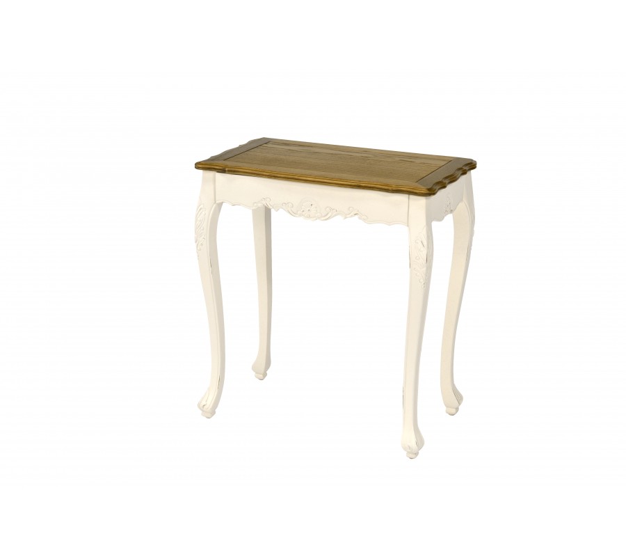 Provensálsky vyrezávaný príručný stolík Preciosa z masívneho dreva v krémovo bielej farbe s prírodne hnedou vrchnou doskou 75cm