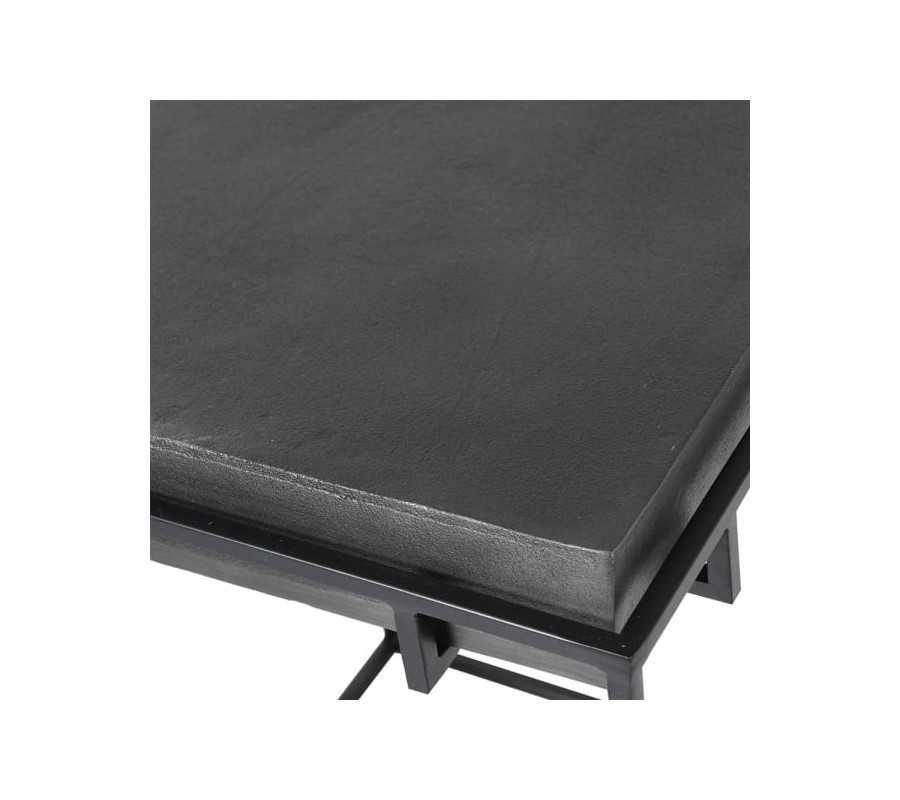Vrchné dosky majú mohutný štvorcový tvar. Ich povrch má výraznú štruktúru pripomínajúcu betón, s viditeľnými nedokonalosťami, ktoré podčiarkujú autenticitu industriálneho štýlu. Čierna farba prináša do kompozície eleganciu a zároveň vizuálne prepája vrchné dosky s podstavou.