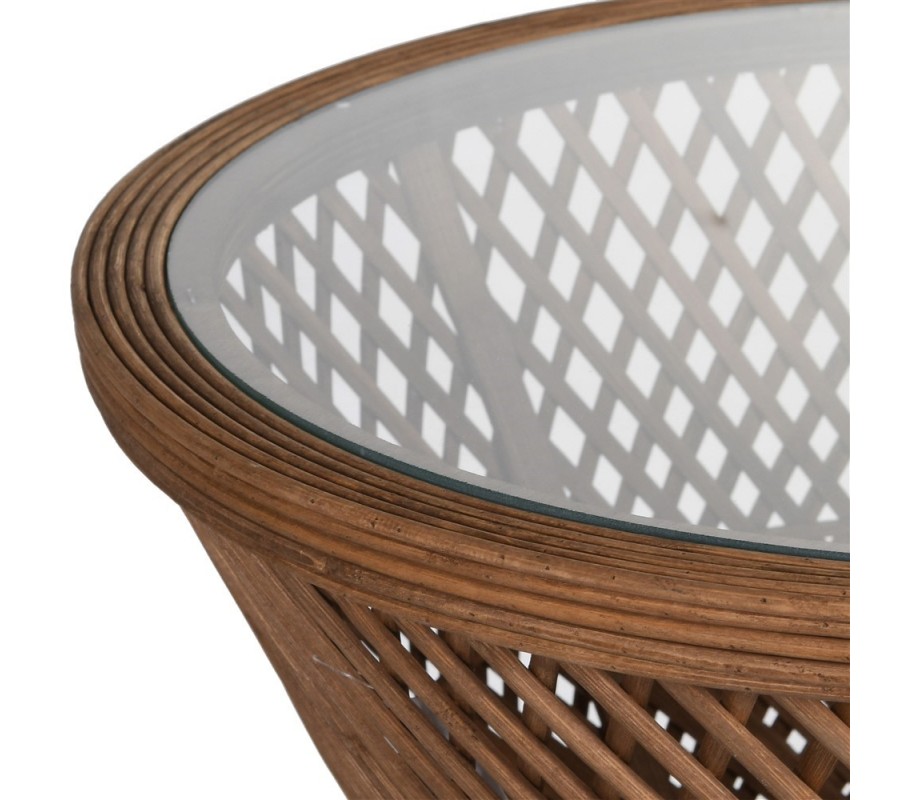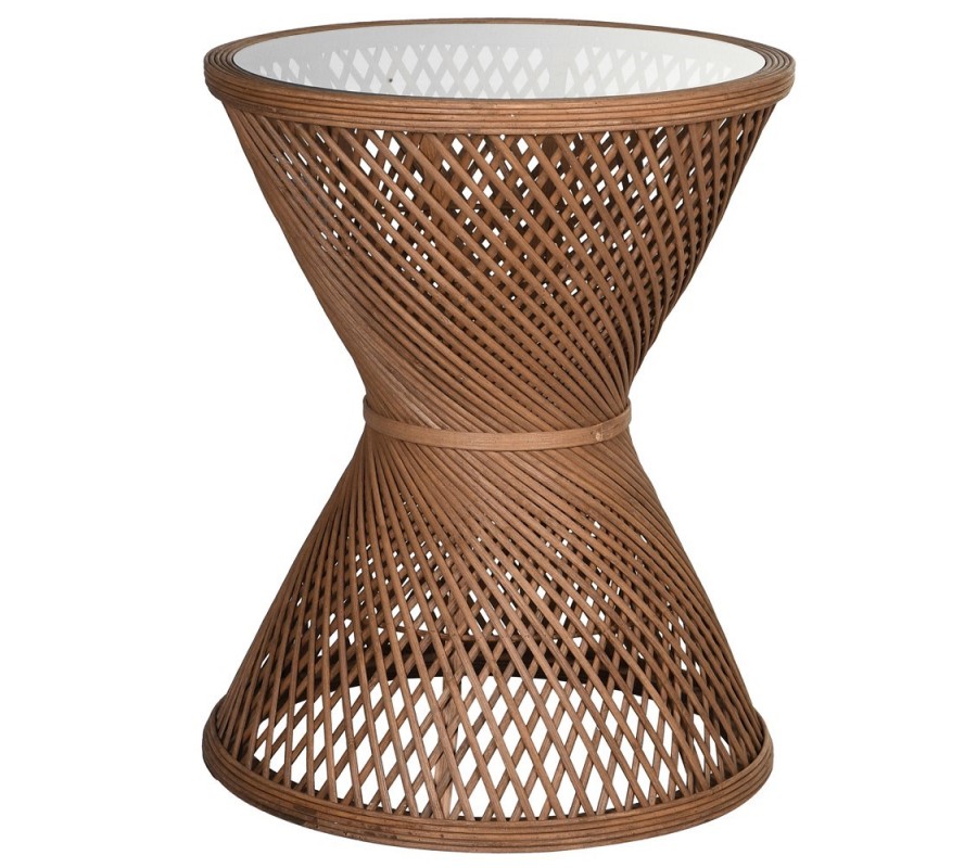 Bambusový príručný stolík Bambi s košíkovitým výpletom v tvare presýpacích hodín so sklenenou okrúhlou vrchnou doskou 59cm