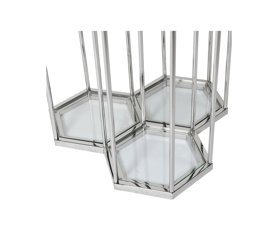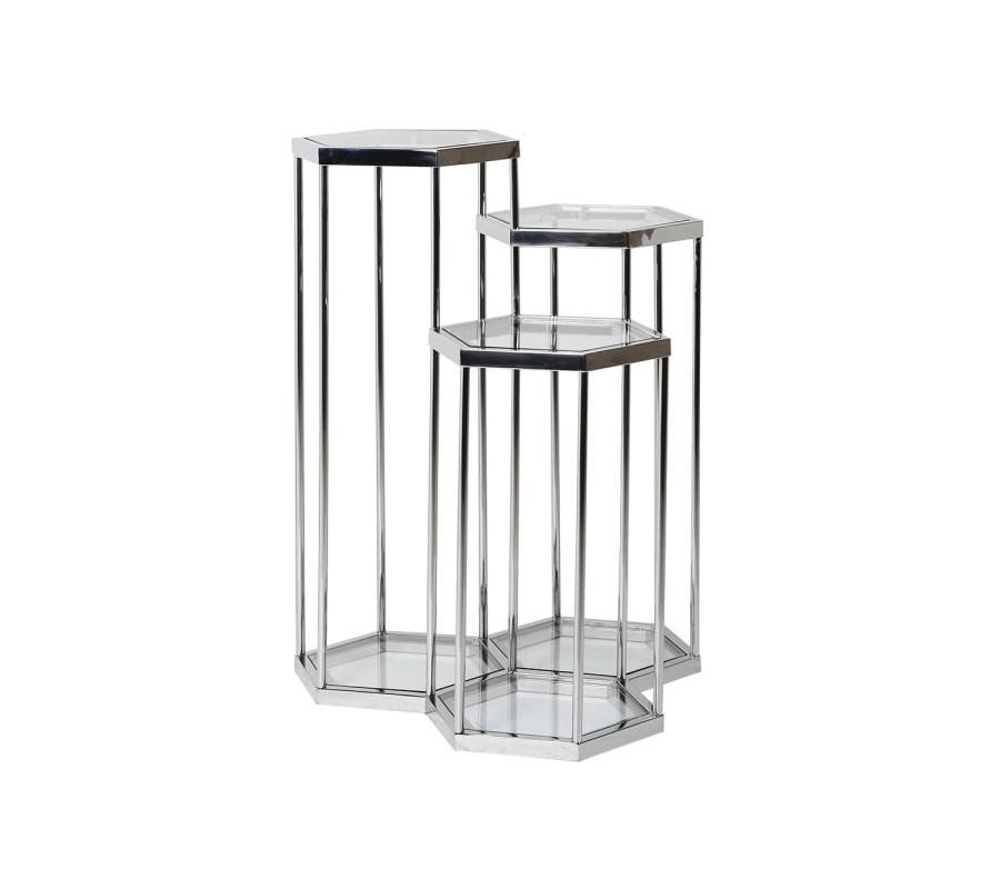 Príručný stolík Helvete je dizajnovým a nadčasovým kúskom, ktorý zaujme najmä svojou jedinečnou konštrukciou. Pozostáva z troch jednotlivých stolíkov rôznych výškových úrovní, ktoré sú navzájom prepojené kovovou chrómovou konštrukciou so sklenenou výplňou. Stolíky majú zaujímavý šesťuholníkový tvar a pripomínajú tak tvar včelích úľov. Tento nadčasový a inovatívny vzhľad vynikne predovšetkým v moderných obývačkách. Kombinácia skla a kovu je typická pre nábytok štýlu art-deco a tak sa vhodne kombinuje aj v takto ladených interiéroch, ideálne v kombinácii s ďalším nábytkom z kovu či skla, čalúnenou zamatovou sedačkou či kreslom a doplnkami so zrkadlovým efektom. Geometrické tvary a minimalistická konštrukcia pôsobia vzdušným dojmom, ktorý pomôže opticky zväčšiť vaše priestory. Príručná zostava Helvete je vynikajúcim doplnkom vhodným na vystavenie dekorácií, izbových rastlín či na odloženie teplého nápoja pri chvíľach večerného relaxu!