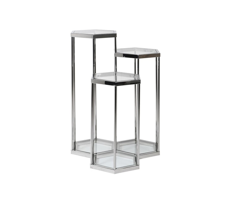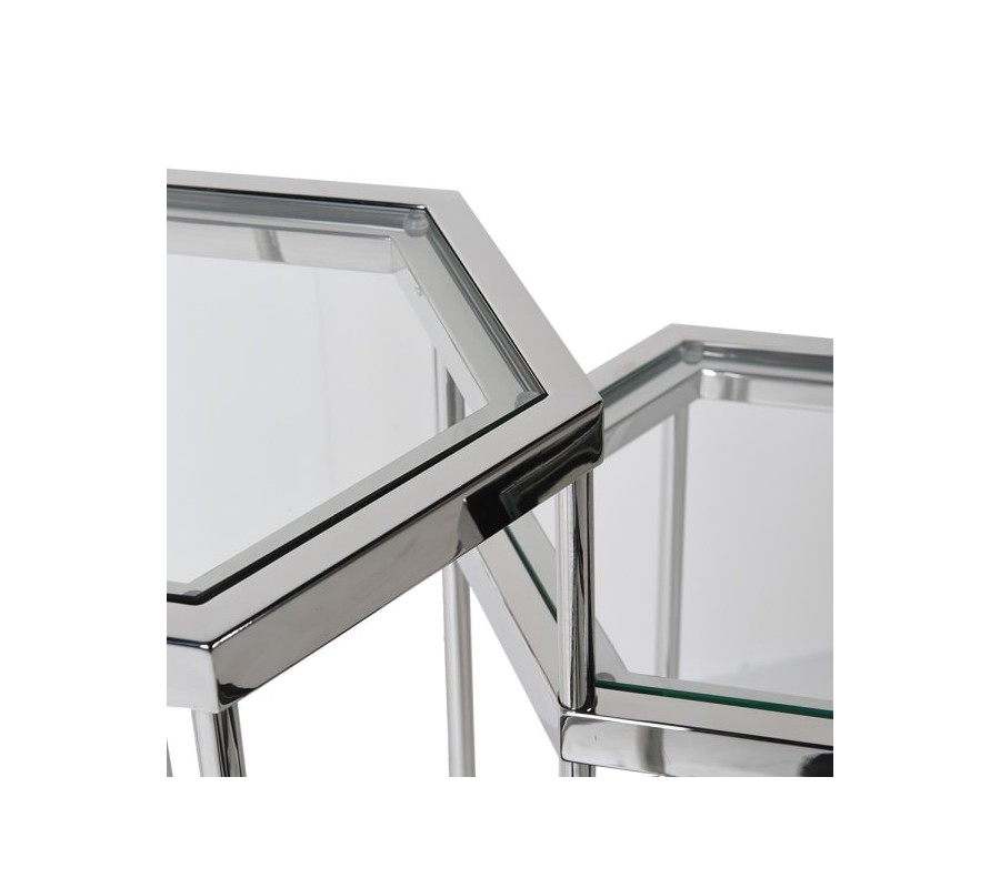 Art deco chrómový príručný stolík Helvete z kovu a skla šesťuholníkového tvaru 90cm