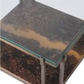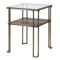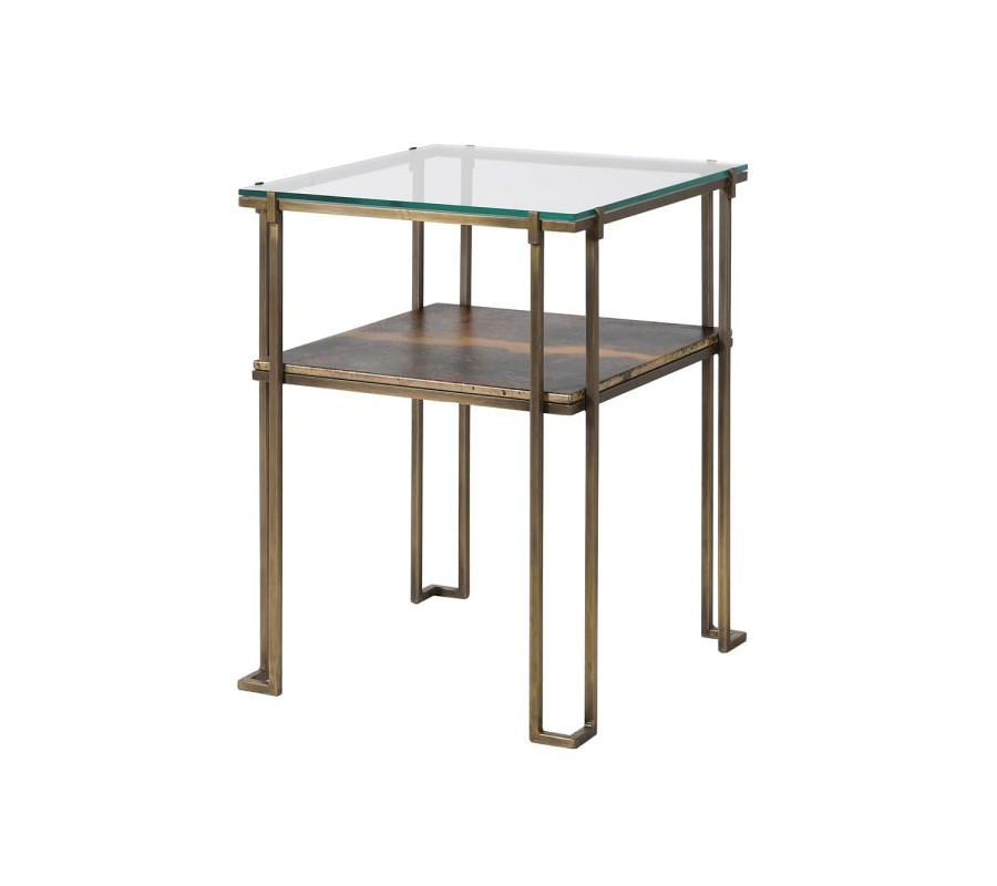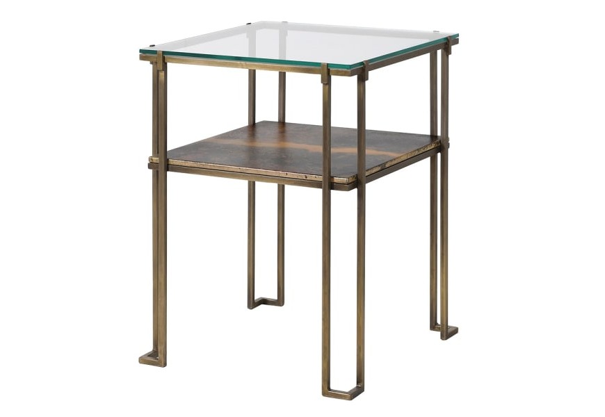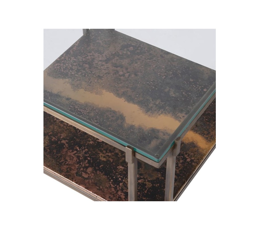 Art deco štvorcový príručný stolík Oxidia s kovovou medenou konštrukciou a sklenenou doskou 62cm