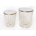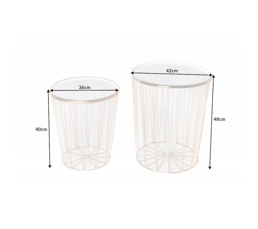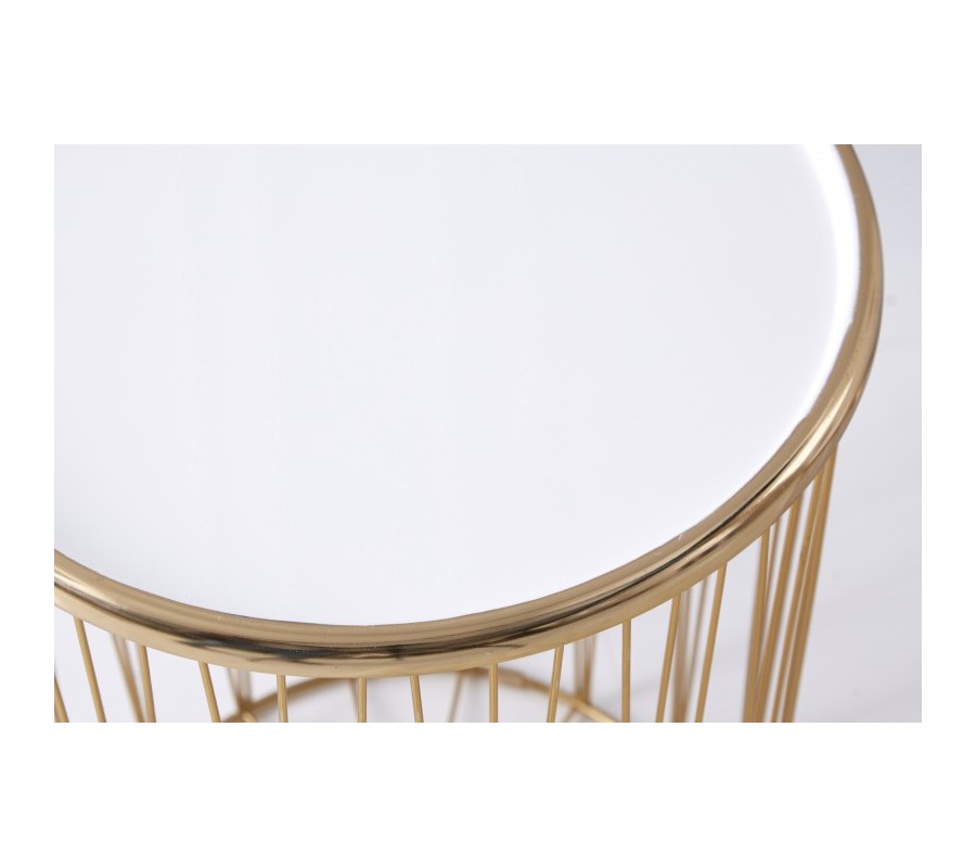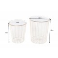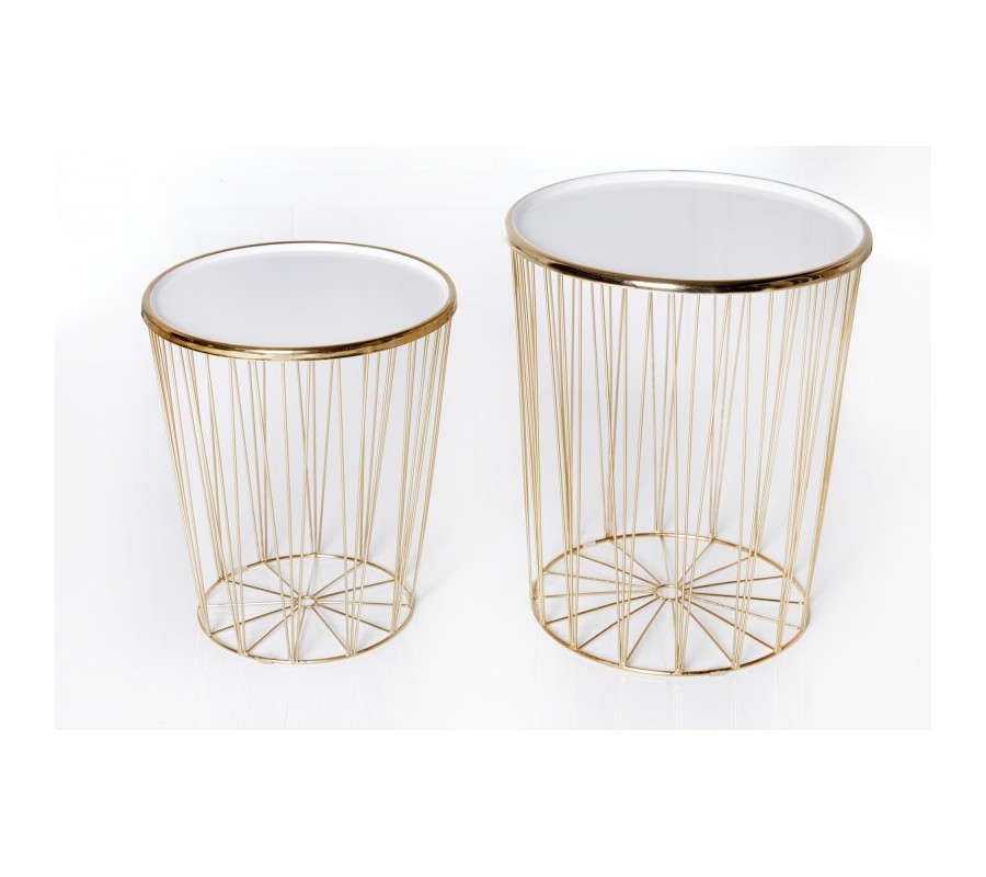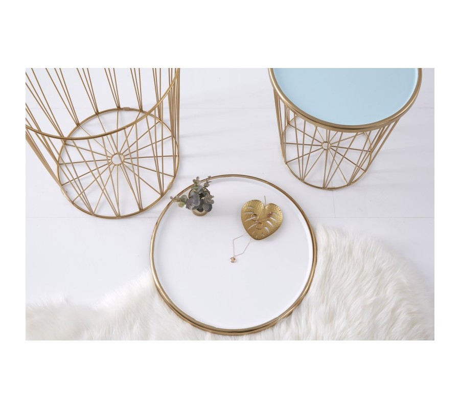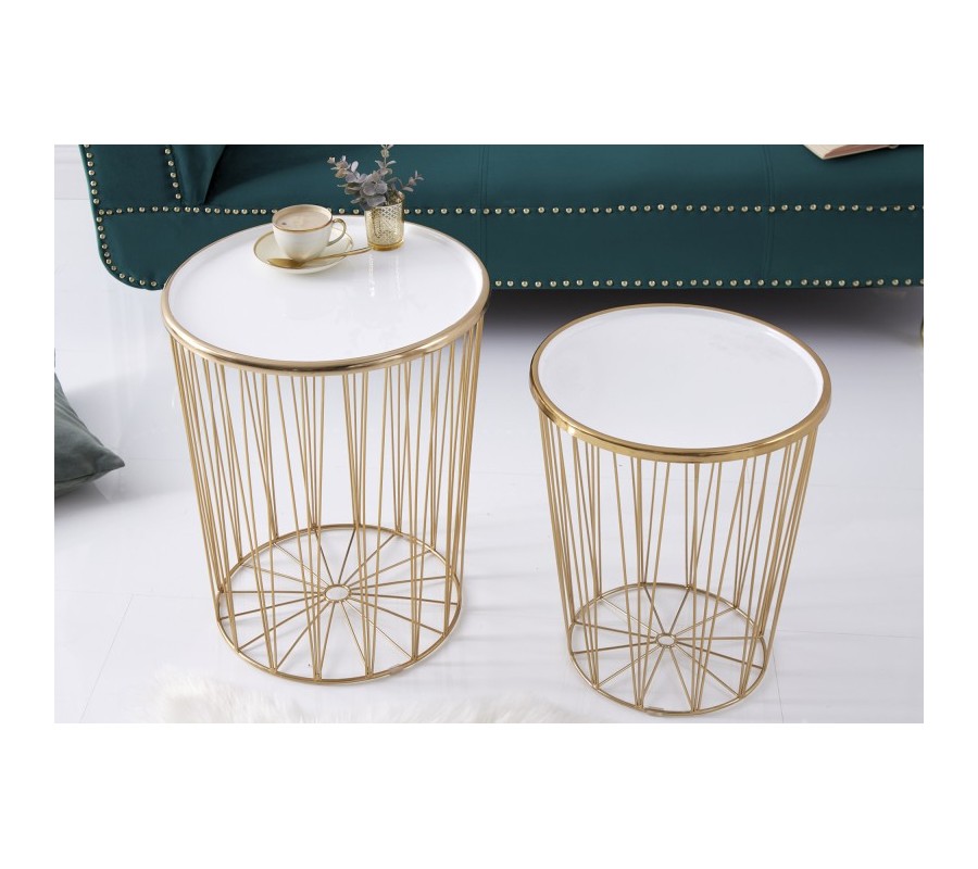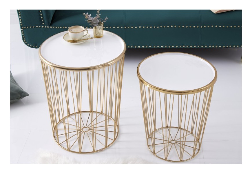 Dizajnovou súpravou dvoch moderných art deco okrúhlych príručných stolíkov potešíte nie len seba, ale aj svojich blízkych. Unikátna lesklá zlatá farba kovového výpletu konštrukcie nádherne prežiari aj menej svetlý menší interiér- či už stolíky umiestnite do obývačky, vstupnej haly alebo jedálne. Sada Saul II pozostáva z väčšieho príručného stolíka s priemerom vrchnej dosky 42cm a výškou 48cm a menšieho stolíka s priemerom 36cm s výškou 40cm. Vrchné dosky oboch stolíkov vyrobené z kovu v krásnej žiarivej bielej farbe s lesklým povrchom sa dajú jednoducho odnímať, a tak stolíky využiť aj na uskladnenie kníh či časopisov. Podstava podopiera jednotlivé lúčovité výplety okrúhlej konštrukcie, ktoré v hornej časti upevňujú vrchnú dosku stolíkov Saul II. Príručné stolíky v kovovom prevedení budú praktickými pomocníkmi v každej modernej a art deco ladenej domácnosti, ale rovnako dobre zapadnú aj do biznis priestorov- napríklad na recepciách či v kanceláriách.