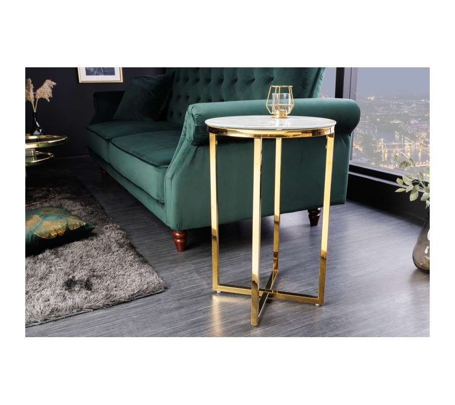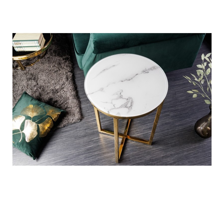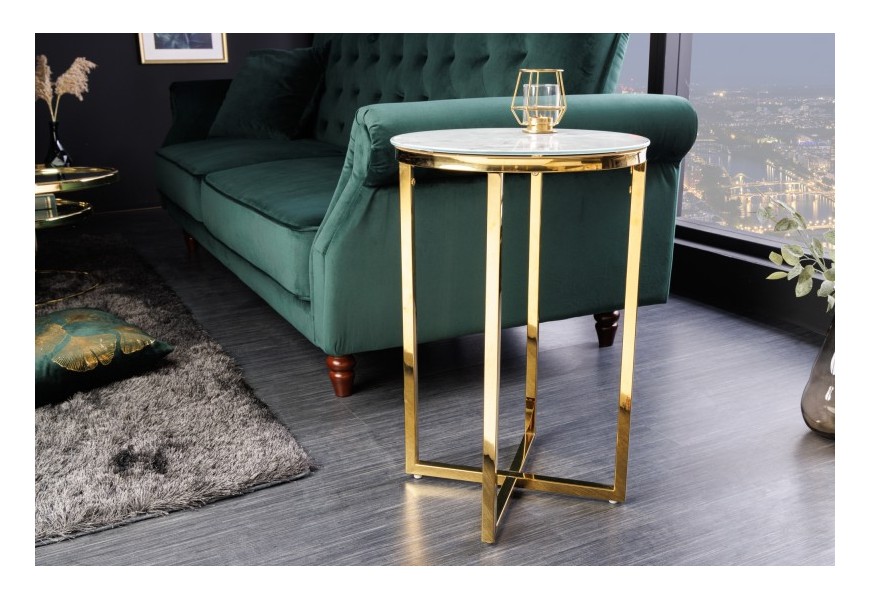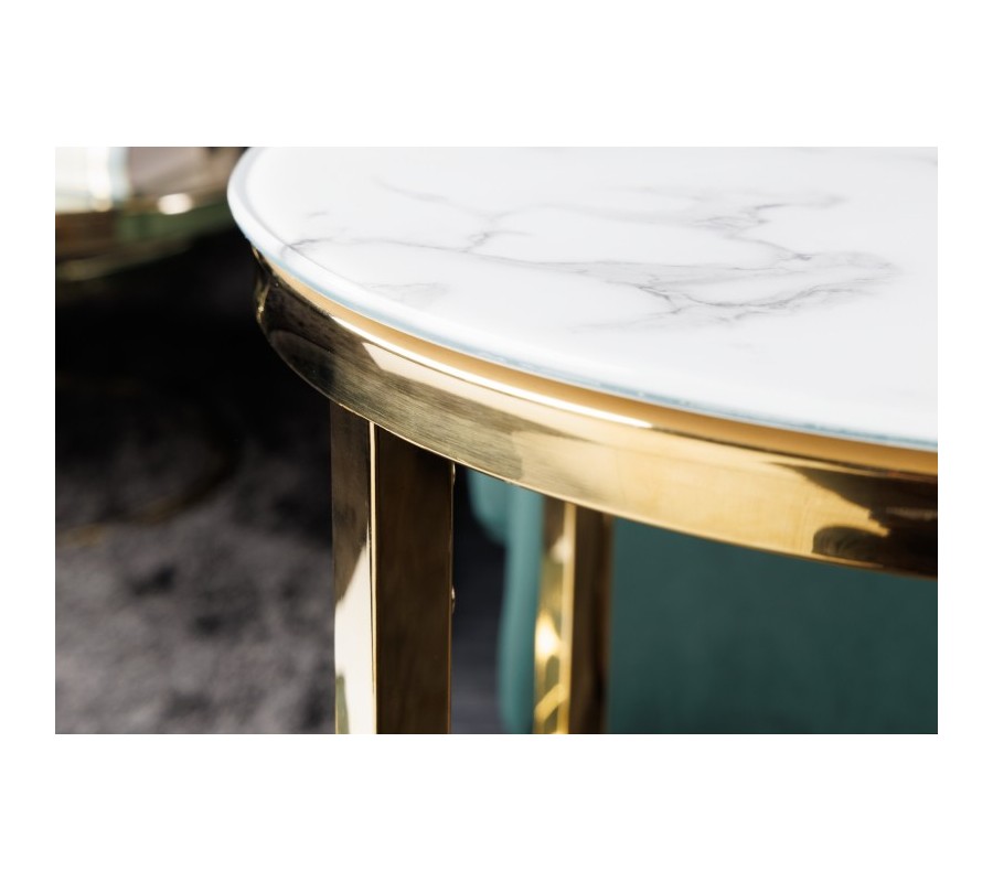 Art-deco okrúhly príručný stolík Gold Marbleux so sklenenou doskou v prevedení biely mramor a podstavou v zlatej farbe 61cm