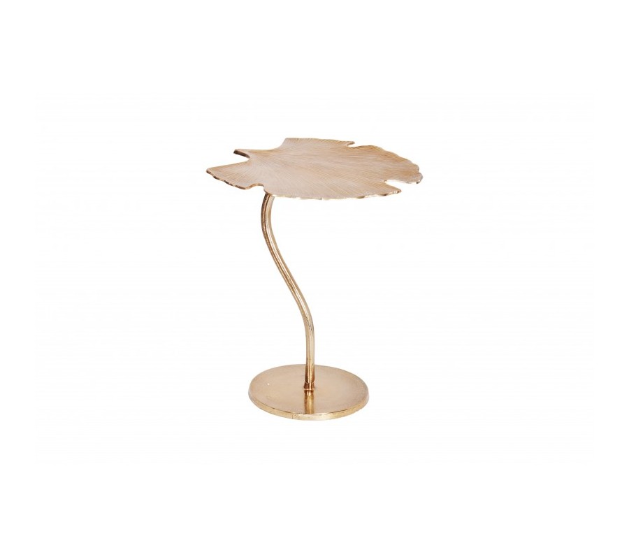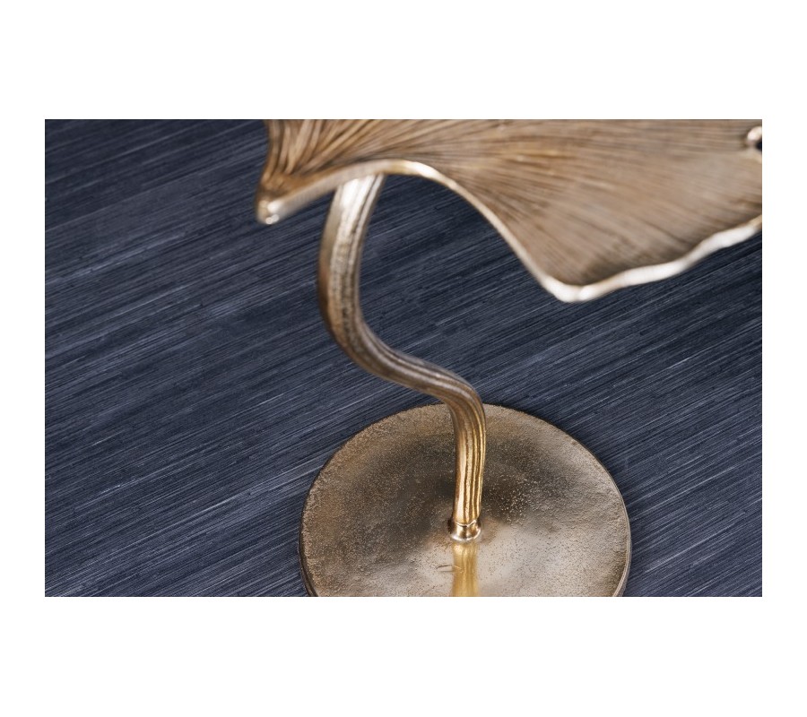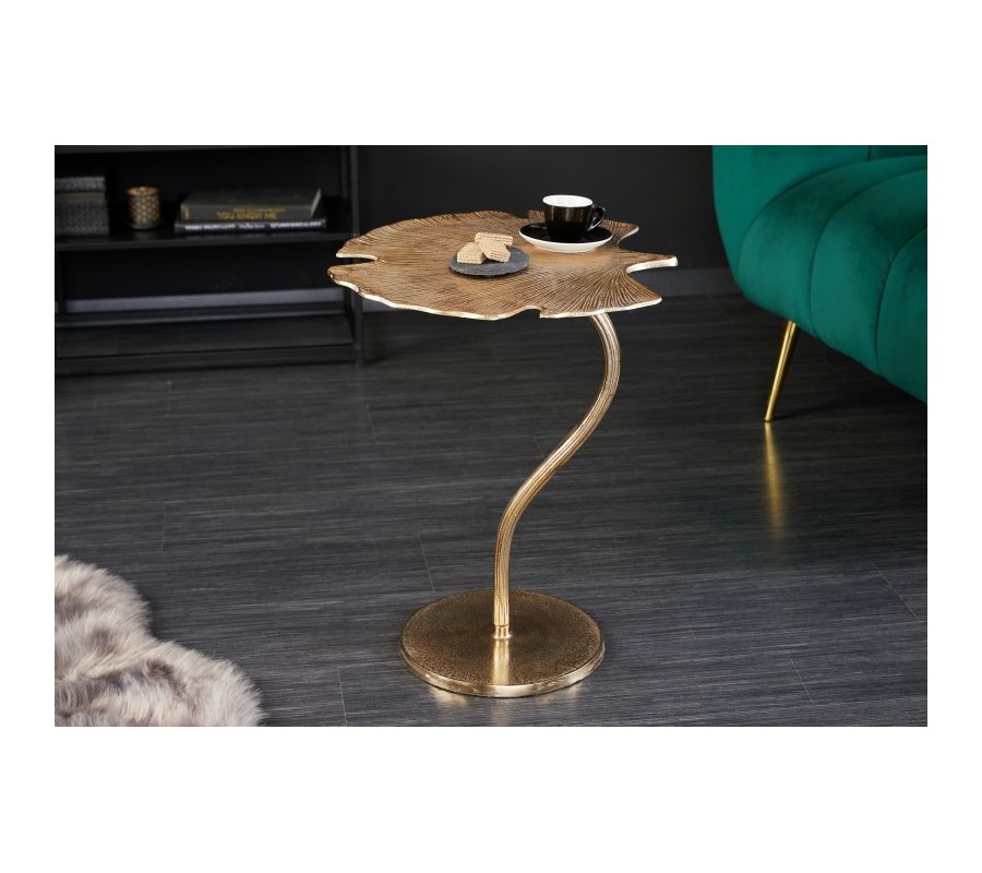 Štýlový art-deco príručný stolík Ginko sa pýši nevšedným vzhľadom, ktorý je dosiahnutý prostredníctvom vzhľadu vrchnej dosky v tvare listku ginko biloba. Art-deco príručný stolík Ginko je vyrábaný z kovu v zlatej farbe, pričom jeho vrchná doska a podstava je špeciálne tvarovaná v spomenutom listovom prevedení s dôrazom na detail a línie vrchnej dosky. Vďaka svojmu dizajnovému prevedniu odporúčame kombinovať príručný stolík Ginko v zlatej farbe do obývačky s kovovým nábytkom a so sedačkami a kreslami so zlatými nožičkami.