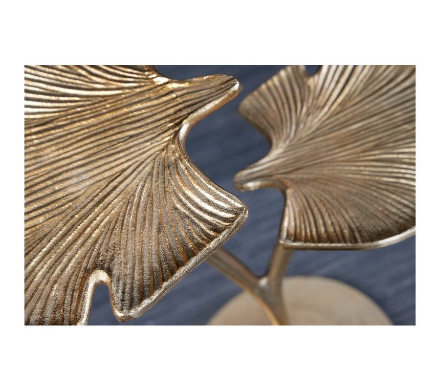 Milovníci prírody a nevšedného nábytku si zamilujú unikátny príručný stolík Ginko z našej rovnomennej art deco kolekcie. Dizajnový príručný stolík Ginko v art-deco štýle sa nesie v prevedení listu rastliny ginko biloba, čo je vidieť na jeho kostre, ktorá je v tvare stonky s dvoma tvarovanámi listami, ktoré naberajú funkciu vrchnej dosky. Príručný stolík Ginko je vyrábaný z kovu v zlatej farbe, čo podčiarkne vzhľad v štýle art-deco. Vďaka svojmu dizajnu v zlatej farbe odporúčame kombinovať príručný stolík v obývačkách s nábytkom s kovovými prvkami ako napríklad so sedačkami so zlatými nožičkami, so zlatými lampami alebo s čiernym kovovým nábytkom.