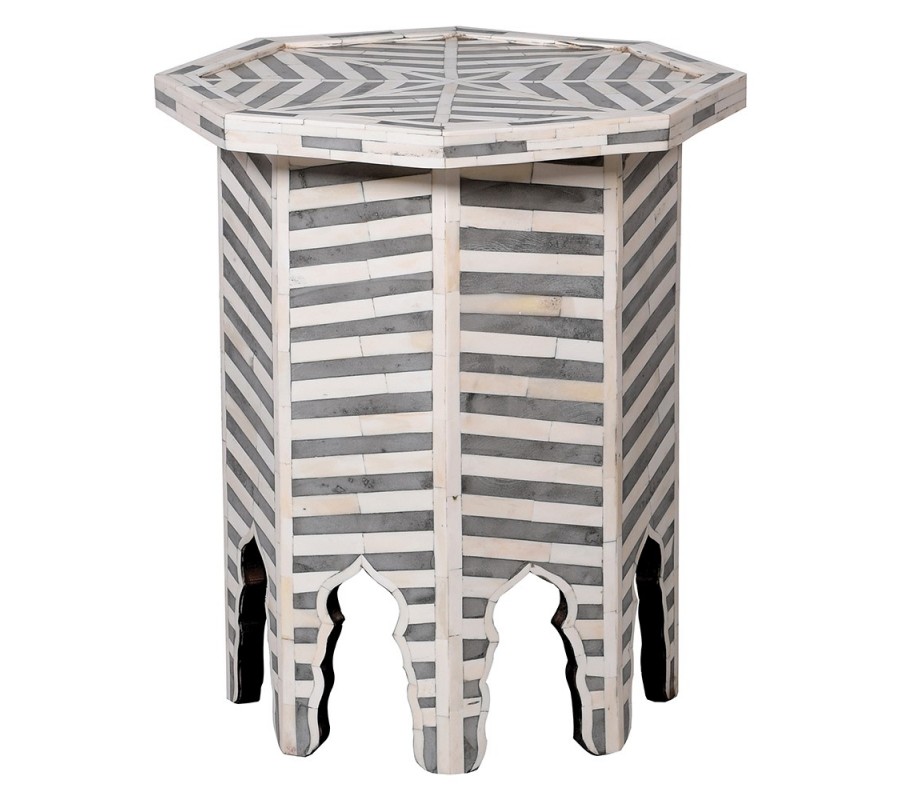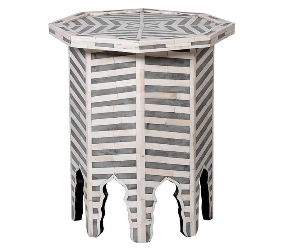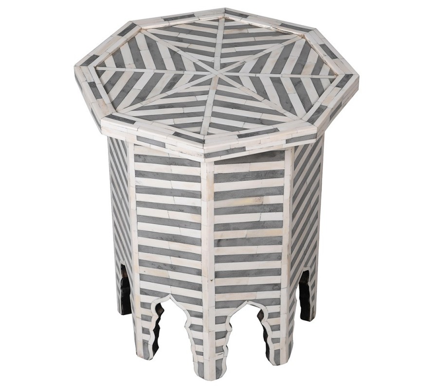 Exkluzívny príručný stolík Garibaldi je predstaviteľom štýlu vintage. Od klasických vintage kúskov sa však líši svojím jedinečným prevedením využívajúcim techniku intarzie, pričom kombinuje materiály masívneho agátového dreva, kosti a živice. Týmto precíznym zdobením vzniká štýlový pruhovaný vzor tvorený ukladaním jednotlivých kúskov obdĺžnikových tvarov vedľa seba. Farebná kombinácia sivej a bielej dodáva stolíku Garibaldi štýlový retro efekt. Zaujímavým prvkom je tiež osemuholníková vrchná doska na ktorej je rovnakou technikou dosiahnutý hviezdicovitý geometrický vzor. Vintage vzhľad umocňujú vyrezávané nožičky pripomínajúce staré architektonické prvky portálov chrámov. Príručný stolík Garibaldi je tak skutočne jedinečným kúskom, ktorý možno využiť na spestrenie vintage či retro ladených obývačiek a pracovní, alebo reprezentatívnych priestorov firiem či štýlových kaviarní. Dokonalú kombináciu vytvorí s rovnomennou stoličkou a výraznými doplnkami vo vintage štýle.