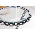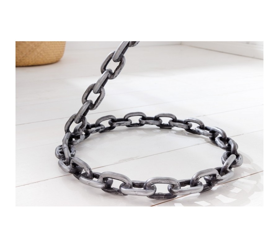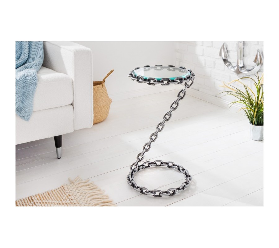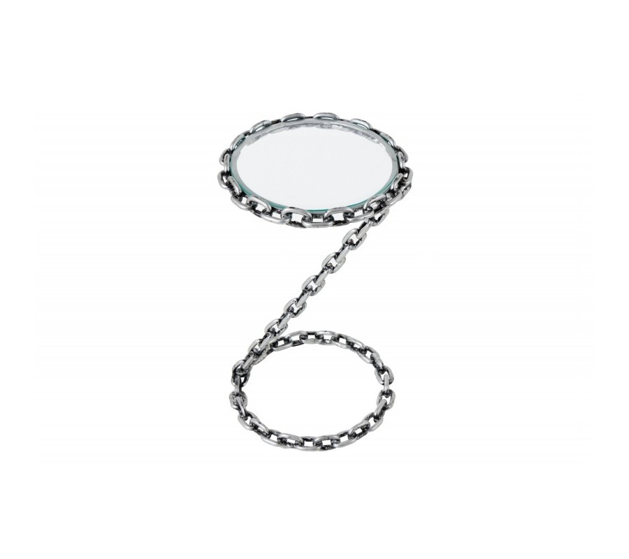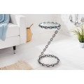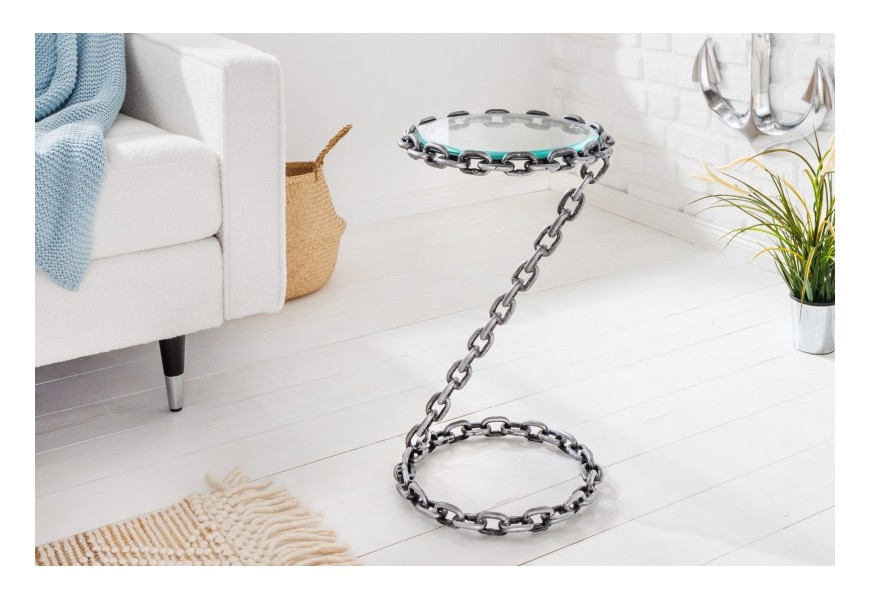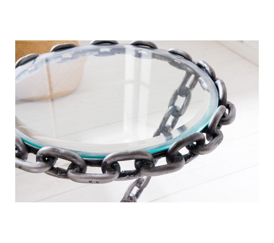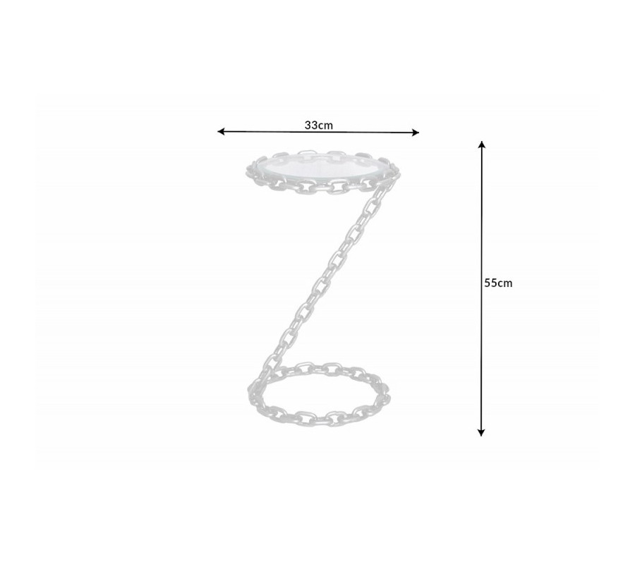 Moderný dizajnový príručný stolík Belime Silver s kovovou reťazovou konštrukciou a okrúhlou doskou zo skla 55cm