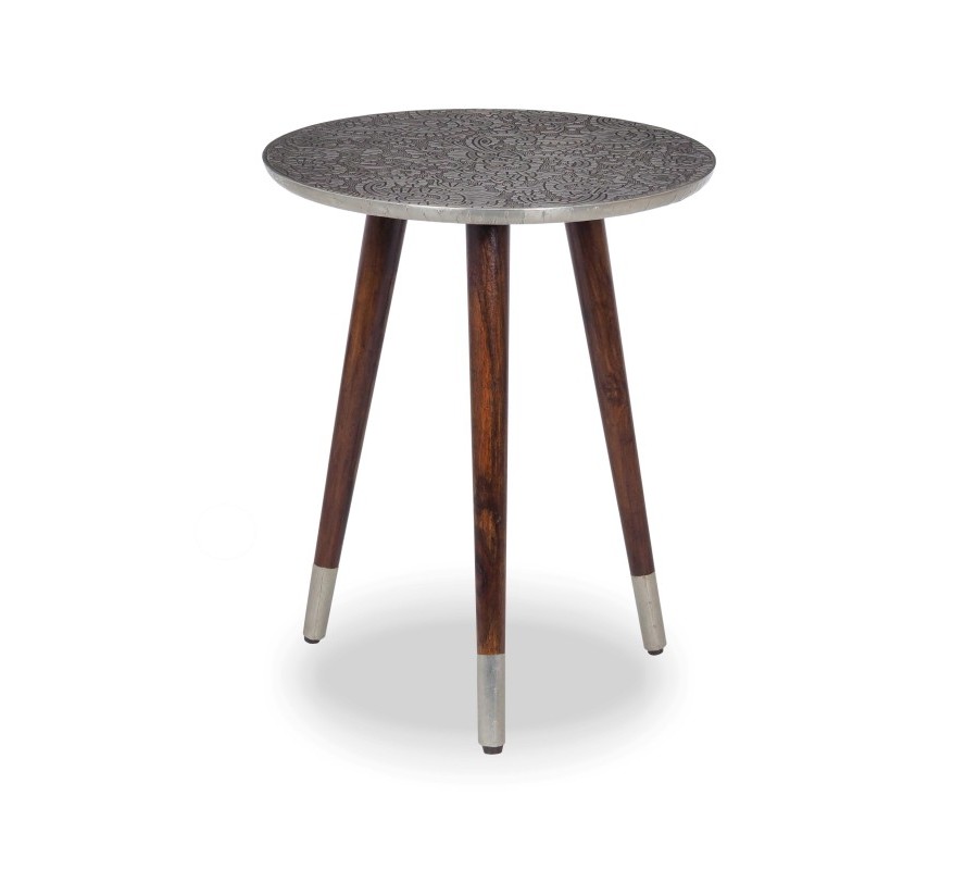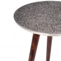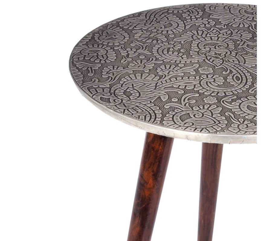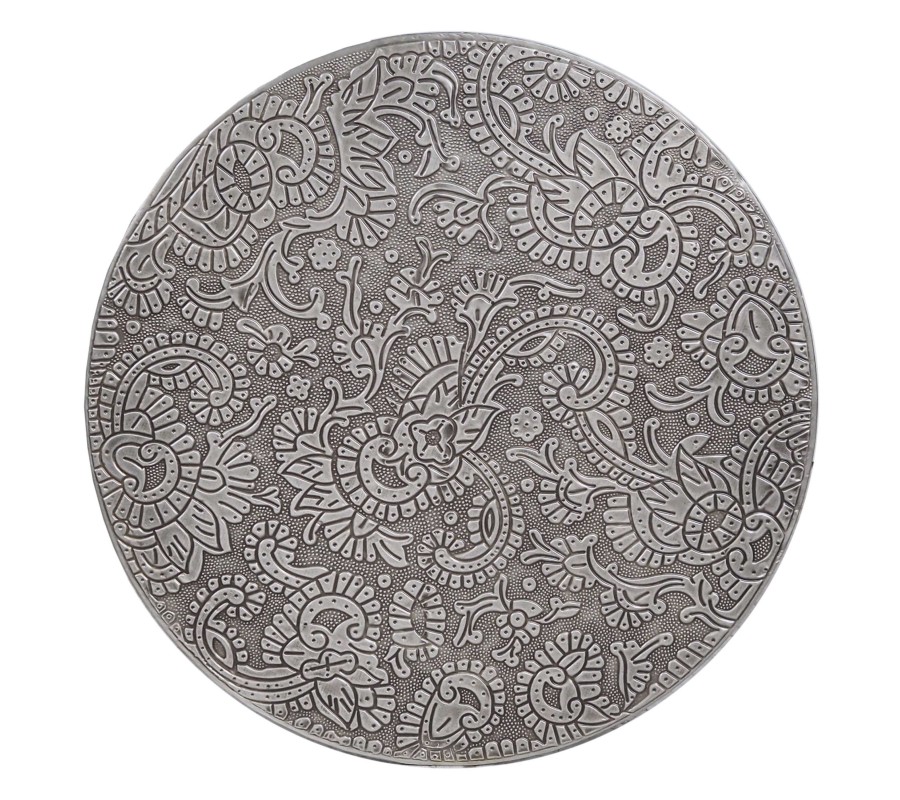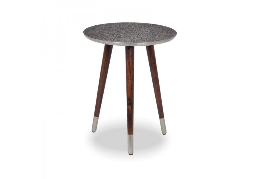 Okrúhly orientálny stolík Alcasar vás na prvý pohľad uchváti svojou zdobenou vrchnou doskou. Je inšpirovaná španielskou architektúrou 12. storočia s arabskými vplyvmi, ktoré priniesli bohaté ornamenty a prírodné motívy. Nožičky sú vyrobené z exotického lakovaného akáciového dreva. Táto kombinácia vnesie do vášho domova ducha ďalekých krajín a orientálneho luxusu. Vrchná doska z kovu je ručne opracovaná, takže každý kus je originálny. Stolík má jednoduchú siluetu s okrúhlou vrchnou časťou a rovnými nožičkami, vďaka čomu vyniká luxusná ornamentácia. Starostrieboná farba na povrchu a na detailoch na nožičkách dodáva vintage vzhľad. Stolík tak nie je len funkčným nábytkom, ale aj výrazným dizajnovým prvkom s osobnosťou, ktorý uchváti vašich hostí. Môžete ho umiestniť do obývačky, pracovne alebo jedálne zariadenej nábytkom vo vintage štýle s podobnými striebornými prvkami. Vhodná je tiež sedačka či stoličky s výrazným čalúnením, napríklad zamatovým. Kombinácia starostriebornej s hlbokými tmavšími farbami, ako napríklad zelená či modrá, prinesie do vašich priestorov luxus a eleganciu.