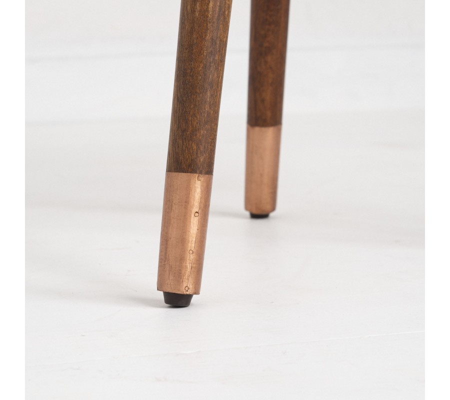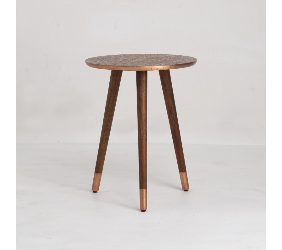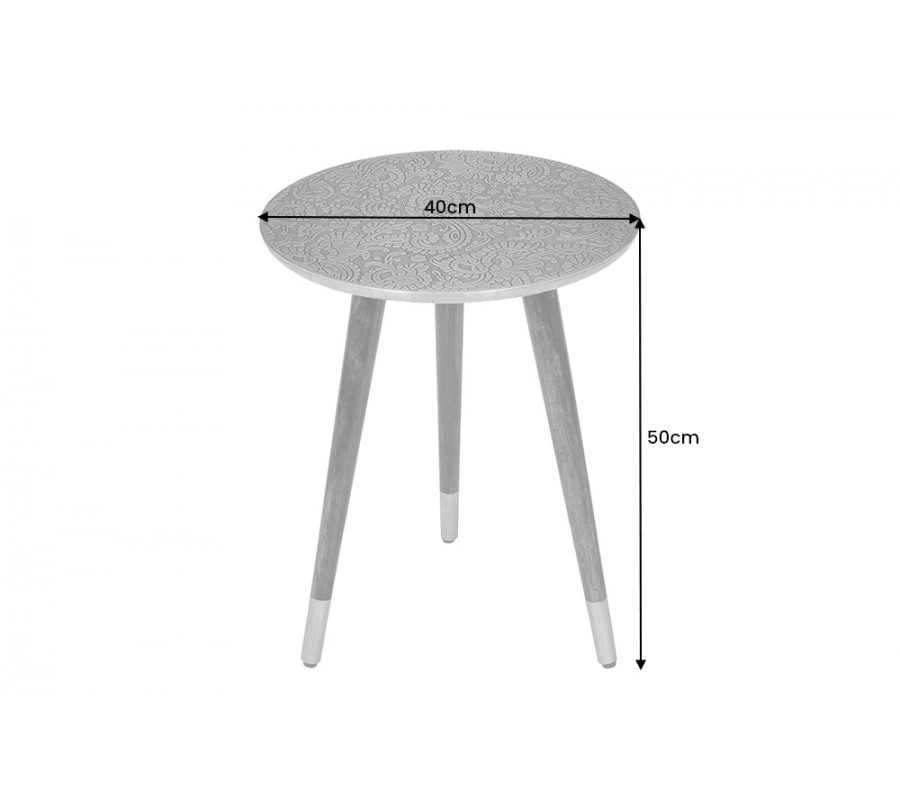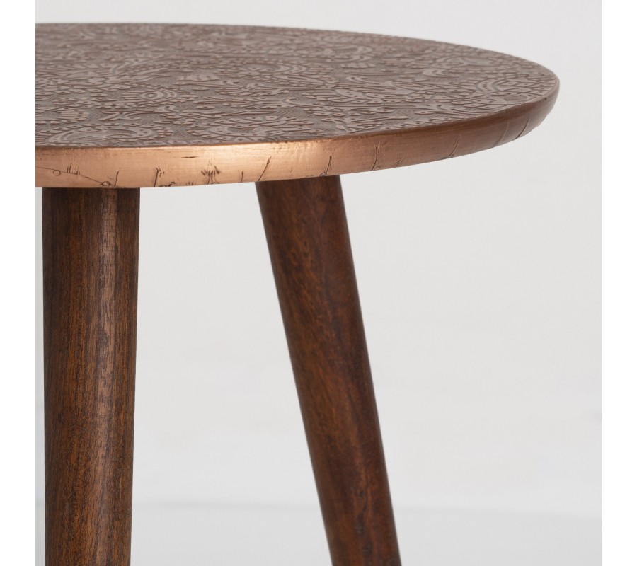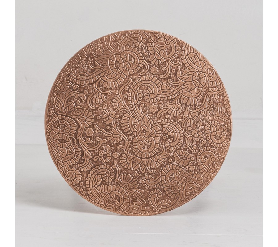 Okrúhly príručný stolík Alcasar je synonymom elegancie a luxusu. Dizajnu dominuje vrchná kovová doska v staromedenej farbe s bohatým ornamentálnym zdobením, ktoré je inšpirované španielskou architektúrou 12. storočia. Výrazné sú arabské vplyvy, ktoré priniesli honosné prírodné vzory. Medenú farbu dopĺňajú nožičky z lakovaného akáciového dreva s červenými tónmi. Vrchná doska je ručne opracovaná, takže každý kus je originálom. Florálne motívy v kombinácii s exotickým drevom prinesú do vášho domova ducha vzdialených krajín a orientálneho luxusu. Stolík môžete doplniť aj vintage nábytkom s detailmi s medenej farbe. Hodia sa k nemu aj stoličky či sedačka so zamatovým čalúnením a textílie vo svetlých odtieňoch béžovej alebo ružovej. Využijete ho v obývačke, jedálni či pracovni. Nie je len funkčným nábytkom, ale vďaka svojmu jedinečnému dizajnu bude aj originálnym dekoratívnym prvkom, ktorý nadchne vašich hostí.