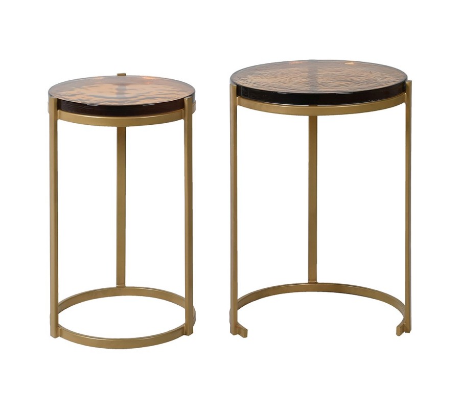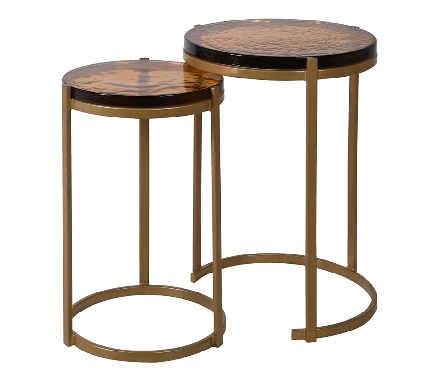 Dizajnový set príručných stolíkov Aquileira prinesie do vašej obývačke štýl a lesk éry art-deco. Tri nožičky stolíka vychádzajú v rovných líniách z kruhovej podstavy a spájajú ju k kruhovým držiakom na vrchnú dosku. Tá je zhotovená z hrubého skla v jedinečnej jantárovej žltej farbe, ktorá svojimi teplými tónmi ladí s farbou nožičiek. Vyšší stolík s výškou 56 cm a priemerom 39 cm má výrez v kruhovej podstave, ktorý vám umožňuje z časti pod neho zasunúť nižší stolík s výškou 51 cm a priemerom 31,5 cm. Táto kompozícia pôsobí moderne a štýlovo. V prípade, ak potrebujete maximalizovať priestor vrchnej plochy, stolíky môžete umiestniť aj vedľa seba. Stolík sa hodí do miestností zariadených v art deco alebo glamour štýle, kde sa prepojí s ďalším nábytkom so zlatými nožičkami či inými lesklými prvkami. Jednoduché geometrické línie dodávajú stolíku nadčasový vzhľad, uplatníte ho teda aj v moderne zariadenej obývačke či pracovni. Farebne ho odporúčame kombinovať s teplými odtieňmi hnedej a žltej.