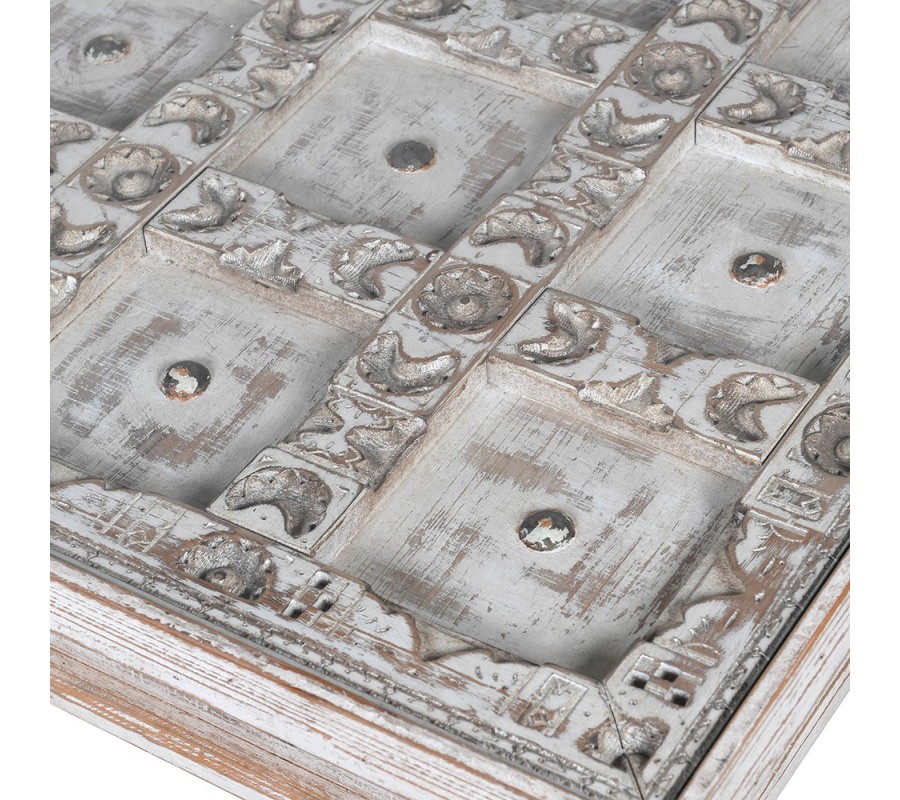 Luxusný príručný stolík Valensole vnesie do vášho domova romantickú atmosféru južného Francúzska. Povrch je upravený bielym náterom, ktorý sa následne zámerne zošúcha tak, aby čiastočne odhalil prirodzenú farbu svetlého masívneho dreva. Vzniká tak veľmi naturálny a vkusný vintage vzhľad. Skutočným pokladom tohto stolíka je však vrchná doska s vyrezávaným kazetovým dizajnom. V zníženom strede každej kazety sa nachádza viditeľná oblá hlavica skrutky, ktorá má v tomto prípade aj estetický účel v celkovej kompozícii. Zdvihnuté okraje kaziet sú zdobené ornamentálnymi motívmi, ktoré v symfónii s nesúmerným náterom vytvárajú dojem nedokonalej dokonalosti. Toto umelecké dielo je prekryté sklenenou doskou, takže stolík je plne funkčným nábytkom. Vrchná doska je spojená s menšou podstavou konkávnou doskou. Na podstave pokračuje kazetový motív, avšak v jednoduchšom lineárnom prevedení. Na každom rohu je upevnená vyrezávaná nožička. Do siluety stolíka prinášajú zaoblené tvary, ktoré sa prepájajú s prvkami ornamentálnej výzdoby a oblými skrutkovými hlavičkami na vrchnej časti. Aj to je dôkazom do posledného detailu premysleného dizajnu. Príručný stolík Valensole je ako stvorený do priestorov zariadených v provensálskom štýle, kde ho môžete doplniť ďalším nábytkom z tejto kolekcie. Môžete ním tiež doplniť vintage kreslo alebo sedačku. Vašej obývačke tak dodáte pocit jedinečnosti a útulnosti, ktorý vyžaruje z týchto kúskov.