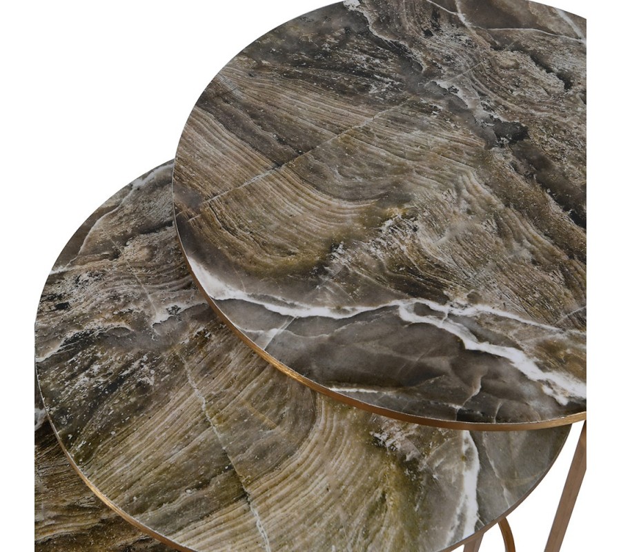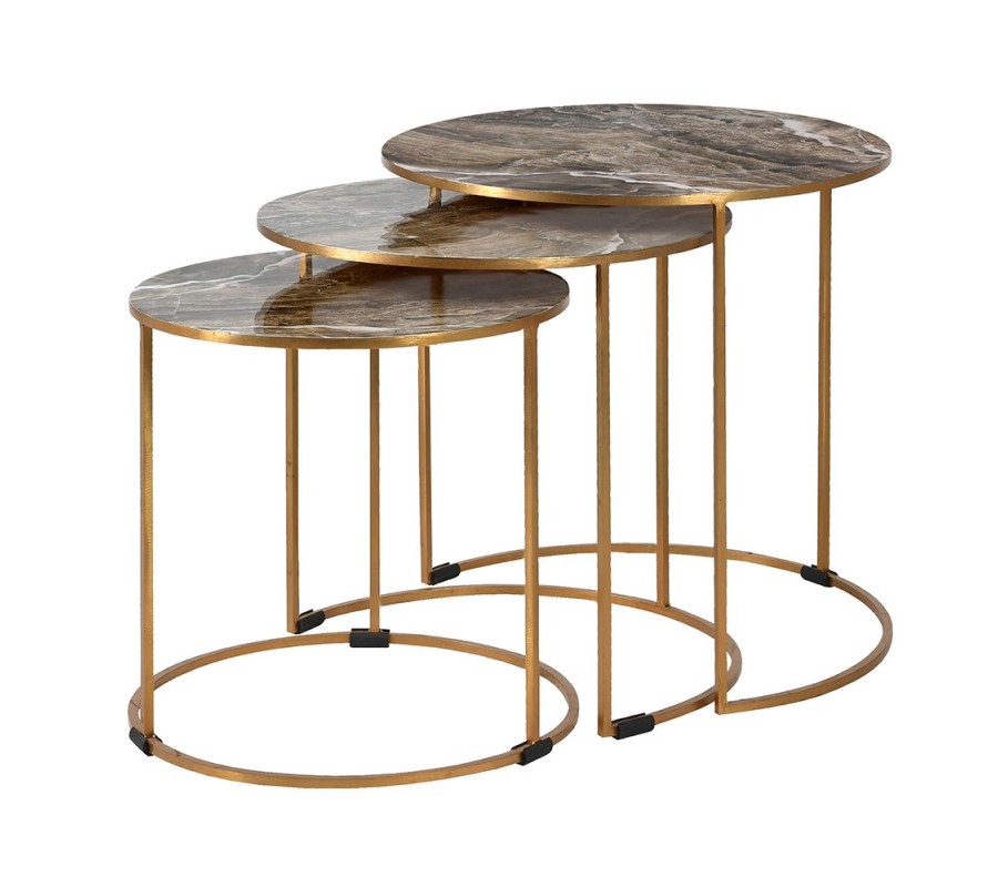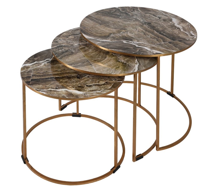 Art deco dizajnový set troch príručných stolíkov Avery zlatej farby s mramorovým povrchom