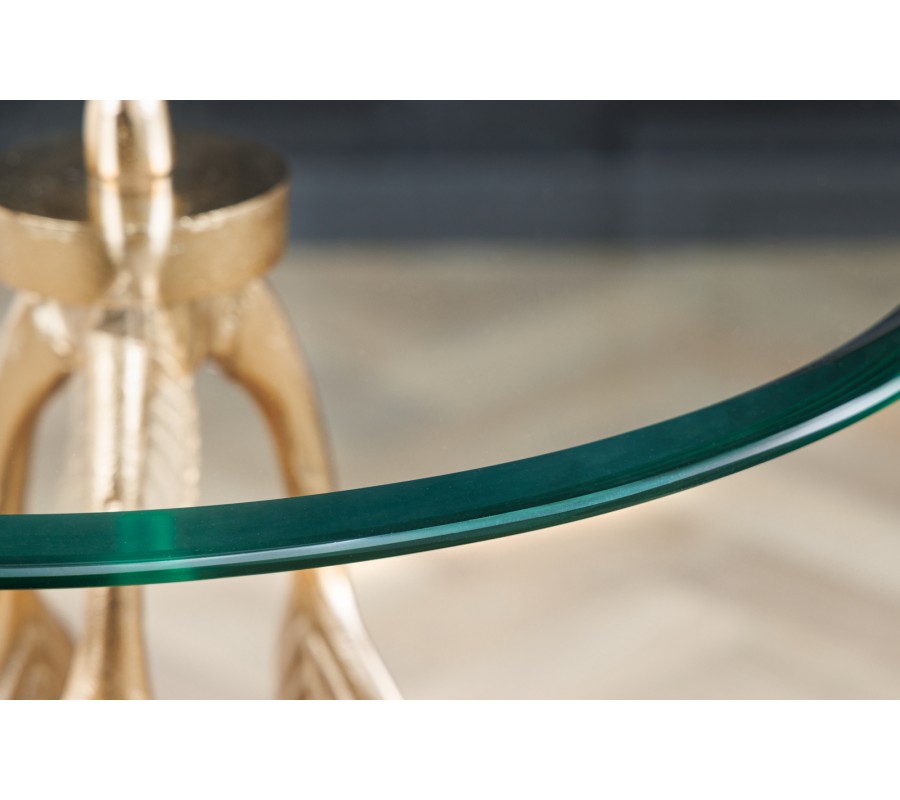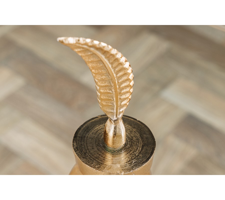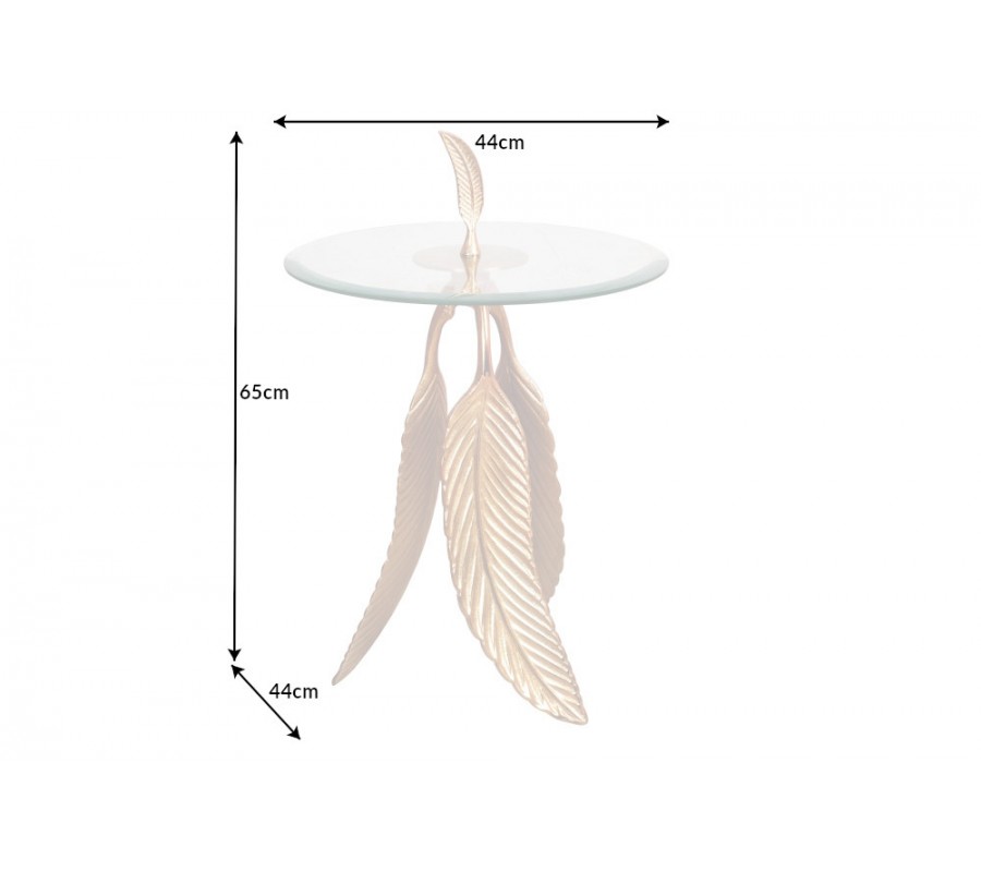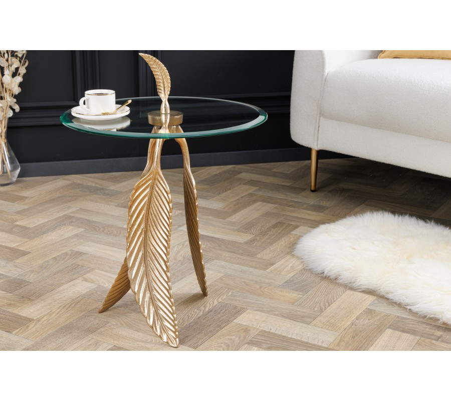 Art-deco okrúhly príručný stolík Pluma so sklenenou vrchnou doskou a podstavou s dizajnom pierok v zlatej farbe 45 cm