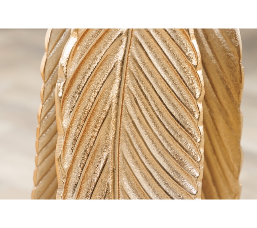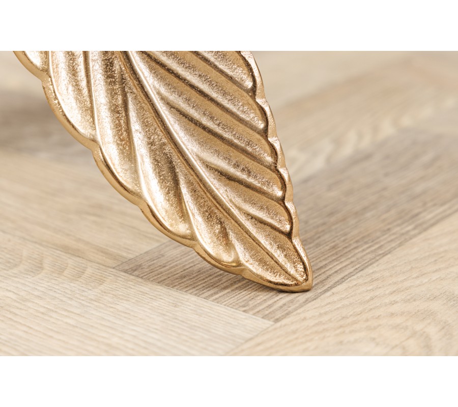 Okrúhly príručný stolík Pluma vás uchváti svojím delikátnym dizajnom. Nožičky stola sú v tvare troch zlatých pierok, spájajúcich sa vo vrchnej časti do valcovej podstavy, na ktorej je uložená jednoduchá okrúhla sklenená doska. Vo vrchnej časti pokračuje motív pierok v podobe originálnej dekorácie umiestnenej v strede sklenenej dosky, ukončujúca vizuálnu centrálnu líniu stolíka. Nožičky stola sú vyrobené z ručne opracovaného kovu, takže každý kus je jedinečným originálnym produktom remeselnej zručnosti. Okrúhla vrchná doska je zhotovená z bezpečnostného skla, špeciálne upraveného kalením. Tento proces mení štruktúra skla a stáva sa z neho veľmi pevný a odolný materiál, ktorý si zachováva vizuálne vlastnosti bežného skla. Zlatá farba dodáva stolíku nádych art deco štýlu a pôsobí honosným a luxusným dojmom. Môžete ho doplniť sedačkou si kreslom so zlatými nožičkami a zamatovým alebo buklé čalúnením, čím ešte posilníte estetiku 20. rokov minulého storočia. Hodí sa tiež do extravagantných priestorov zariadených lesklým nábytkom v glamour štýle.