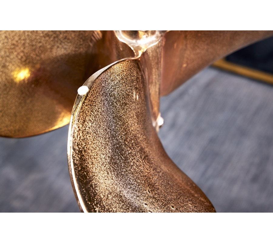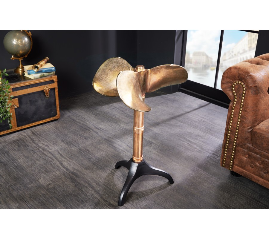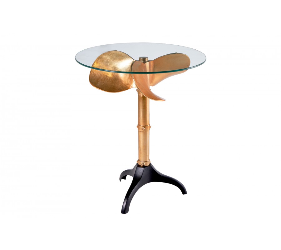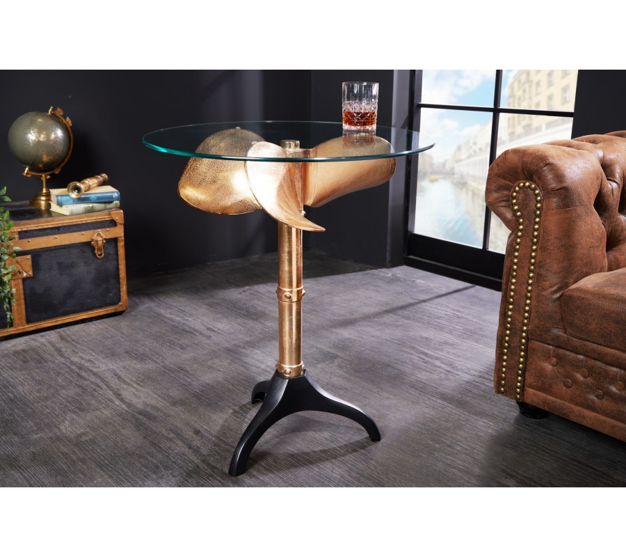 Koloniálny príručný stolík Helice so sklenenou vrchnou doskou a nohou s dizajnom lodnej skrutky v zlatej farbe 73 cm