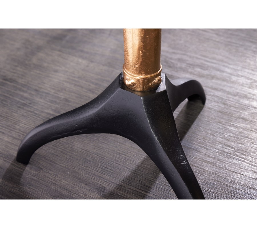 Príručný stolík Helice prinesie do vášho domova koloniálny luxus a dobrodružnú atmosféru ciest do ďalekých krajín. Dizajnu dominuje kovová noha stola v zlatej farbe so štýlový zakončením v tvare lodnej skrutky na vrchnej časti. Na nej je položená sklenená vrchná doska z bezpečnostného skla, ktoré je špeciálne upravené kalením. Vďaka tomuto procesu je nesmierne pevné a odolné a zároveň si ponecháva vizuálne vlastnosti klasického skla, takže cez neho môžete naplno obdivovať delikátny dizajn masívnej zlatej skrutky. Centrálnu os stolíka tvorí zlatá noha ukončená nízkou čiernou podstavou s tromi nožičkami, ktoré dodávajú nábytku stabilitu. Stolík Helice je funkčnou odkladacou plochou a zároveň výrazným dekoratívnym doplnkom. Môžete ho doplniť kreslom alebo stoličkou so zlatými nožičkami v štýle art deco. Hodí sa tiež do pracovne alebo knižnice v koloniálnom štýle, kde ho môžete prepojiť s drevenným nábytkom s orientálnymi vzormi, výraznejšími vintage kúskami alebo vašimi obľúbenými suvenírmi z ciest.