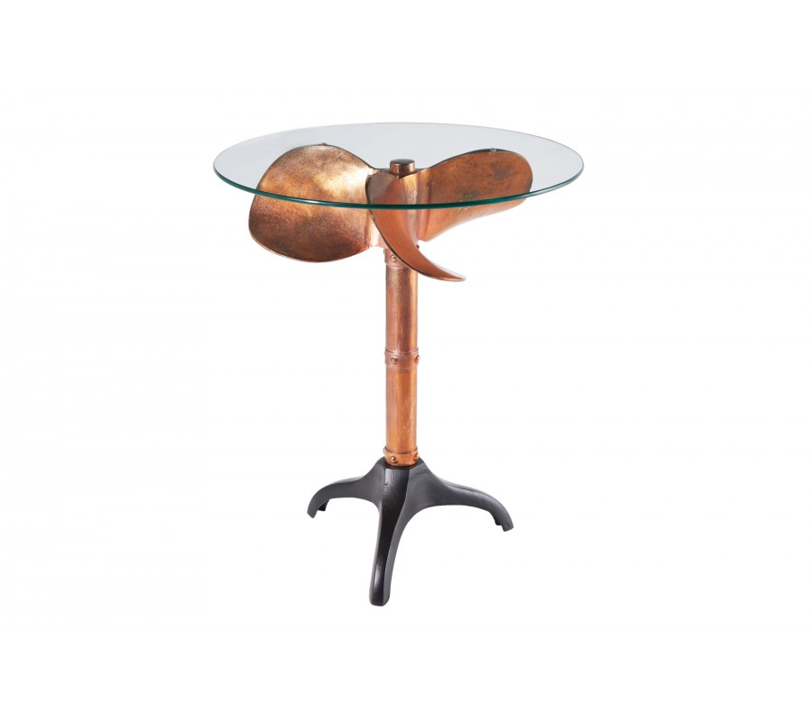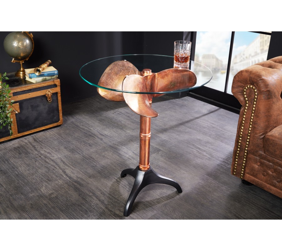 Koloniálny okrúhly príručný stolík Helice s nohou v medenej farbe s dizajnom lodnej skrutky a sklenenou vrchnou doskou 73 cm