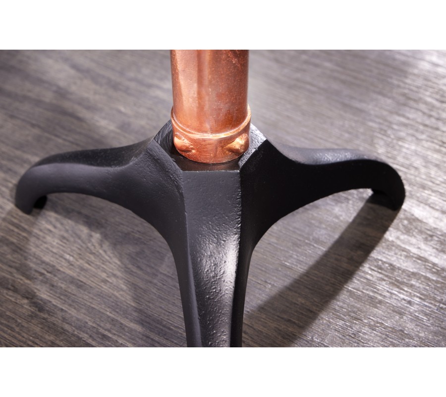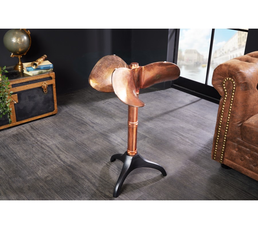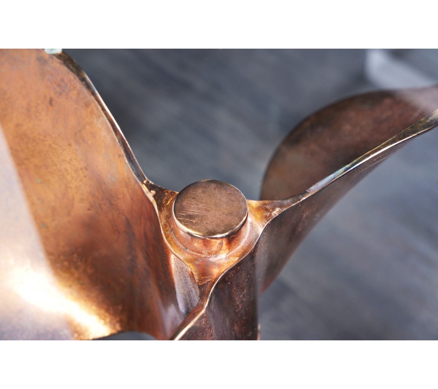 Okrúhly príručný stolík Helice je spojením praktického nábytku a extravagantného dizajnu. Okrúhla vrchná doska je vyrobená z bezpečnostného skla, ktoré je mimoriadne pevné a odolné a zároveň vám umožňuje naplno obdivovať vrchnú časť nohy stola v tvare trojramennej lodnej skrutky v medenej farbe. Na spodnej strane sa nachádza čierna podstava s tromi nožičkami, ktoré zaručujú stolíku stabilitu. Medená farba spolu s delikátnym dizajnom dodávajú stolíku nádych kolonialistického štýlu, ktorý je inšpirovaný cestami do exotických krajín. Stolík môžete preto doplniť ďalšími doplnkami v tomto štýle, ako napríklad glóbusmi, mapami, modelom lode vo fľaši či vašimi obľúbenými suvenírmi z ciest. Hodí sa tiež k výraznejším vintage kúskom s jedinečným dizajnom. Táto kombinácia vytvorí šarmantnú eklektickú estetiku pôsobiacu osobným dojmom. Stolík tiež skvele doplní luxusné materiály, ako mramor, či kožené čalúnenie. Medená farba zvýrazní ich exkluzívny charakter a bude mať funkciu praktického odkladacieho miesta a dekoratívneho prvku zároveň.