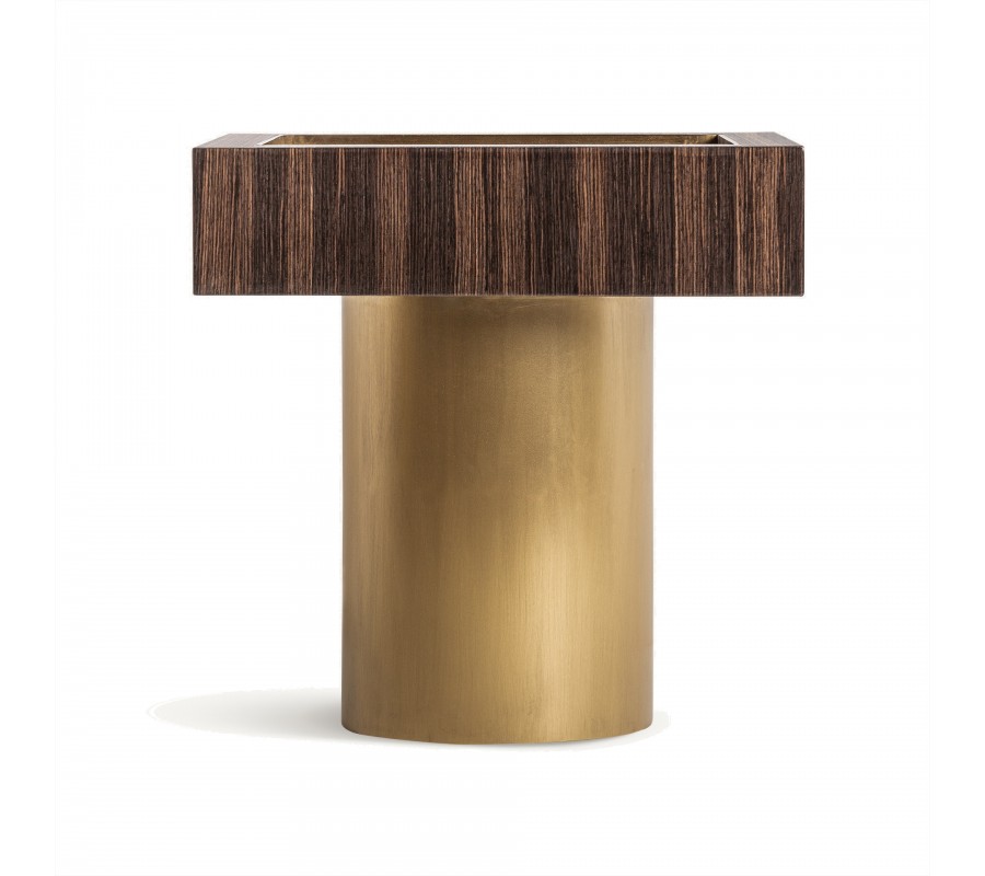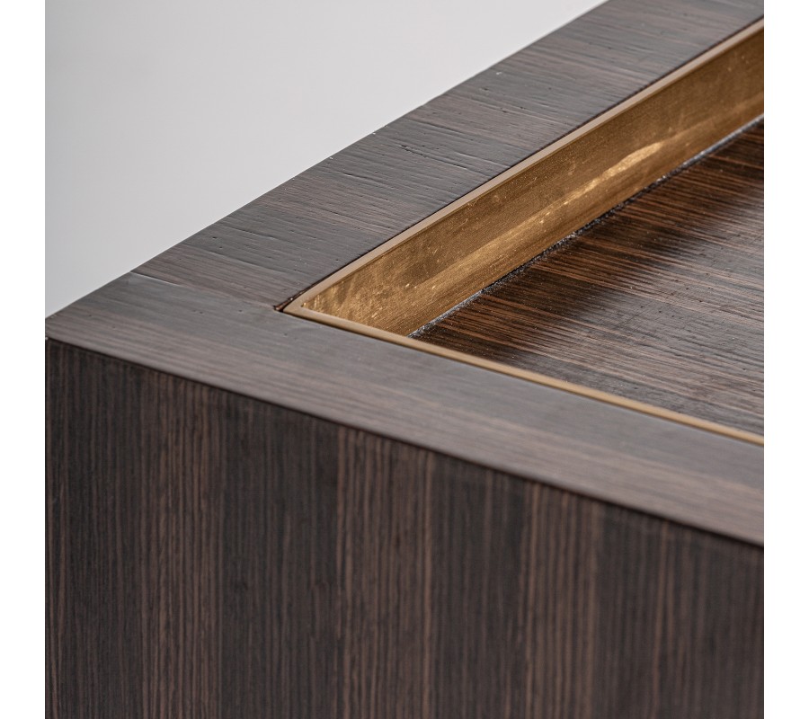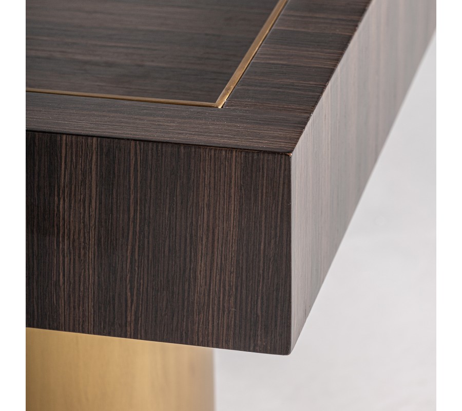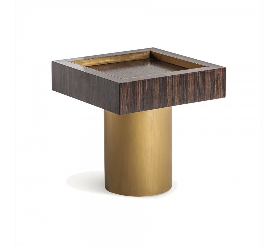 Stolík je vybavený štvorcovou doskou, ktorá je lemovaná a vyvýšená rovnakým dreveným hnedým materiálom ako celá doska, pričom vnútorné strany vyvýšenia sú zlatej farby, čím sa dosiahne harmónia a jednotnosť v celkovom dizajne. Táto doska ,so vzorom rovných línií, ponúka dostatok miesta na umiestnenie vašej obľúbenej čajovej šálky, knihy alebo dekoratívnych predmetov.
