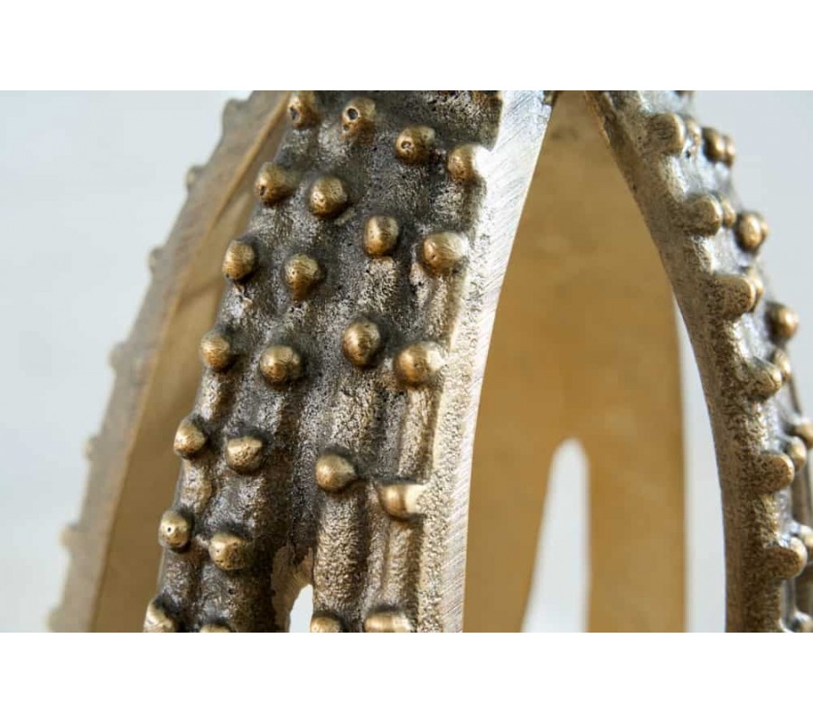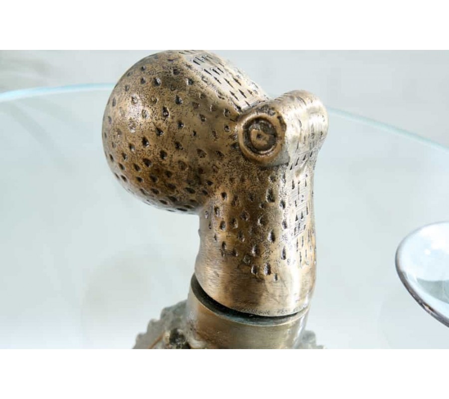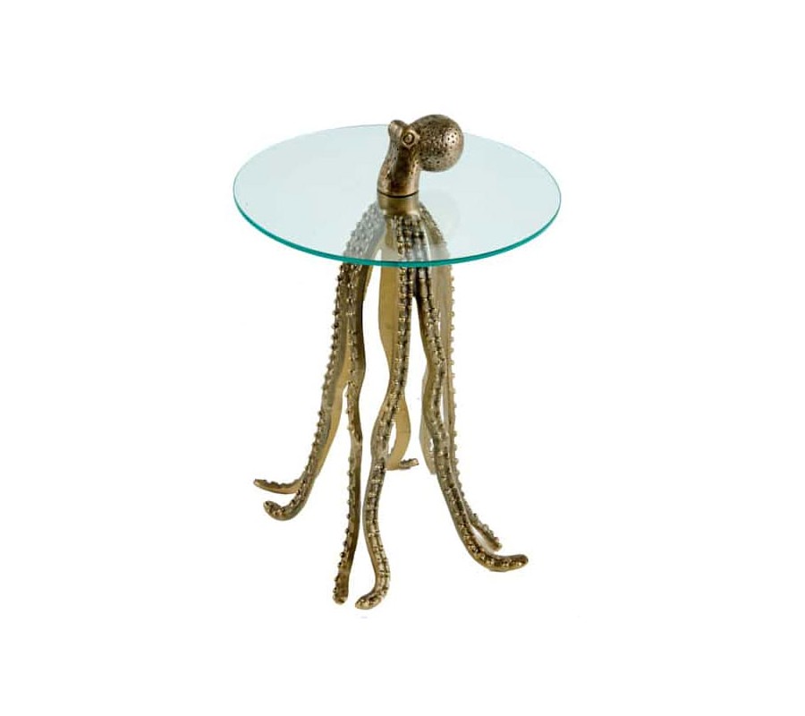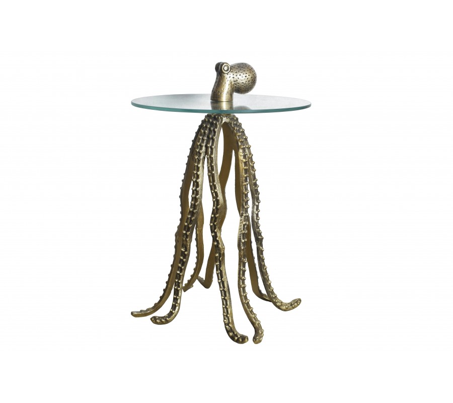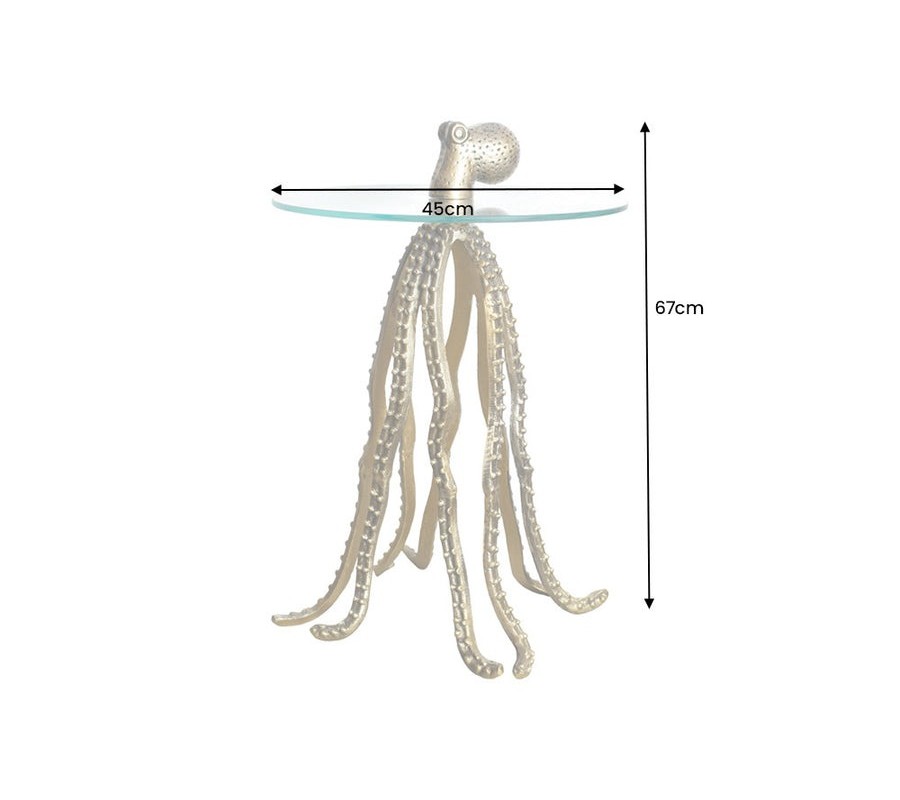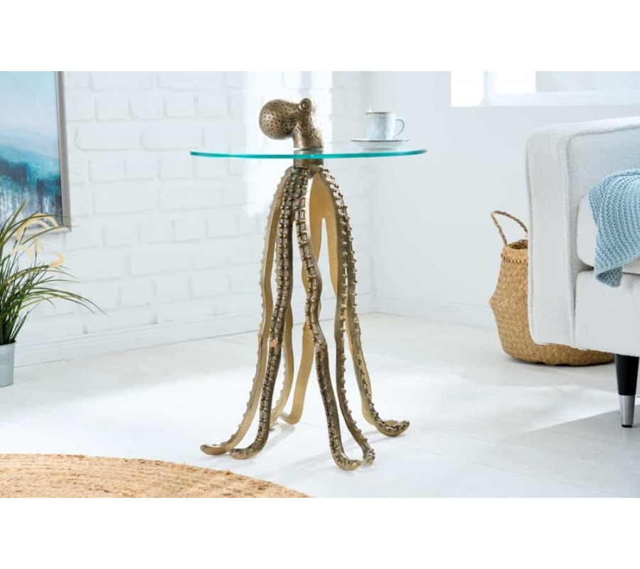 Okrúhly príručný stolík Polbitta v sebe spája moderný dizajn s prírodnou inšpiráciou. Dominantným prvkom je fascinujúca, ručne opracovaná skulpturálna podstava, ktorá má tvar chobotnice s ôsmimi chápadlami. Do kompozície skvele zapadá aj okrúhla sklenená doska, ktorá pôsobí ako čistá a priehľadná hladina pokojného oceánu. Je vyrobená z bezpečnostného skla, ktoré je mimoriadne obľúbeným materiálom kvôli svojej vysokej odolnosti a pevnosti, no zároveň je zachovaný čistý a priehľadný vzhľad klasického skla. Podstava je zhotovená z kovu v mosadznej zlatej farbe. Ručné tepanie zaručuje dôsledné prepracovanie každého detailu na tele chobotnice a vďaka tomu je každý produkt jedinečným originálom. Motív tohto exotického morského živočícha robí z príručného stolíka ideálny doplnok do priestorov zariadených v koloniálnom štýle, kde ho môžete skombinovať s koženým kreslom. Zlatá farba sa skvele prepojí aj s nábytkom v glamour štýle, kde môžete pridať výrazné farby či zvieracie vzory pre hravý extravagantný vzhľad. V moderne zariadenej obývačke či jedálni bude zasa stolík výrazným akcentovým prvkom a oceníte nie len jeho praktickú odkladaciu plochu, ale tiež aj dekoratívnu funkciu.
