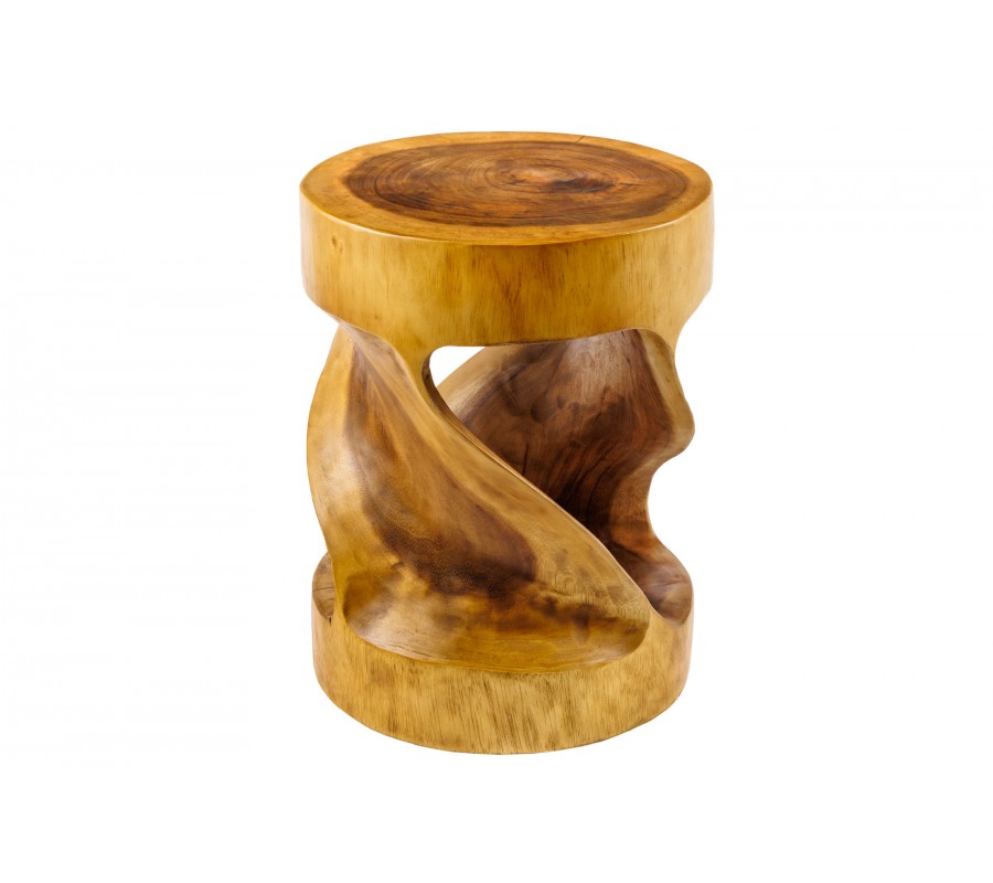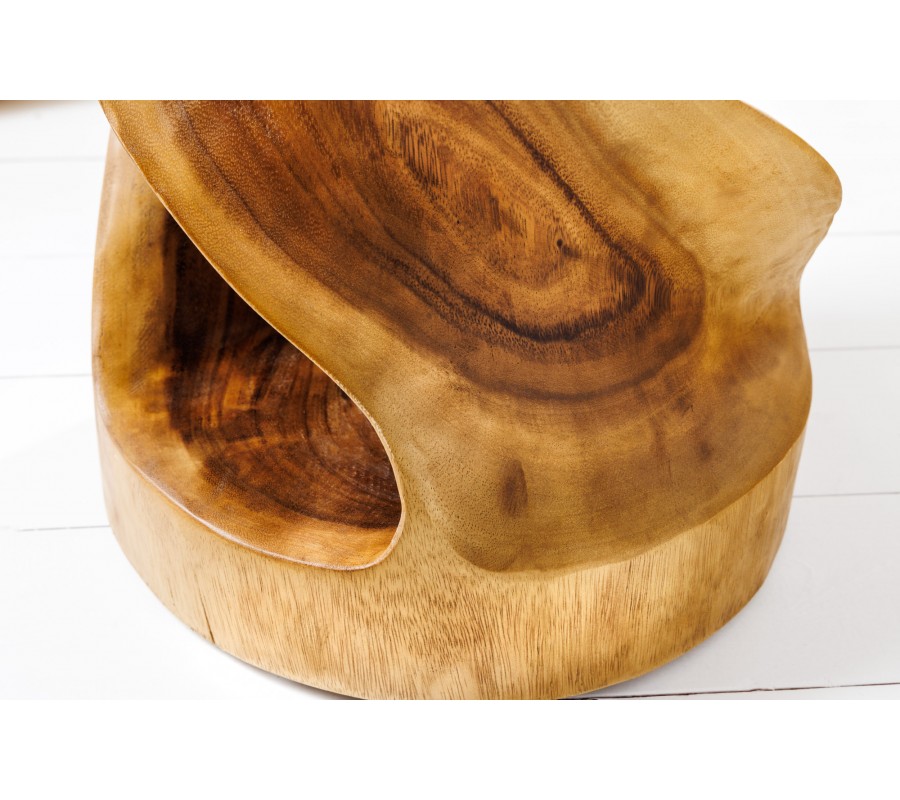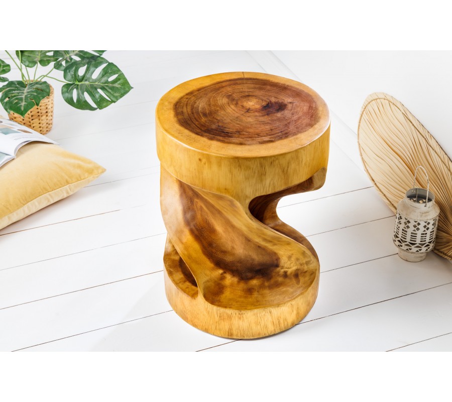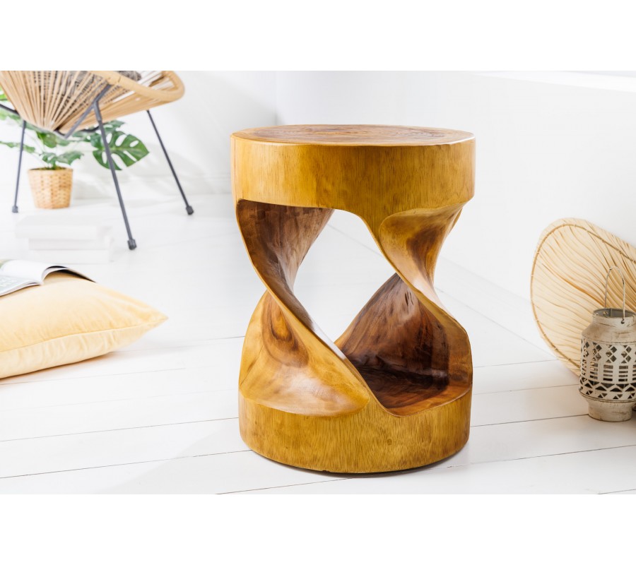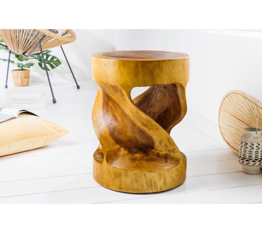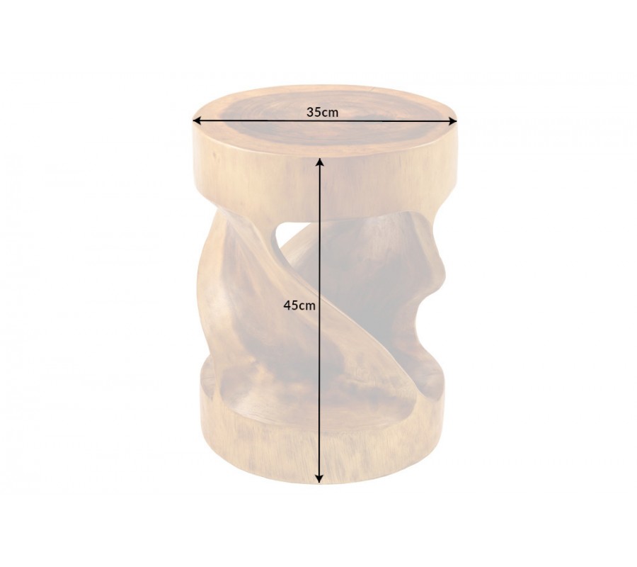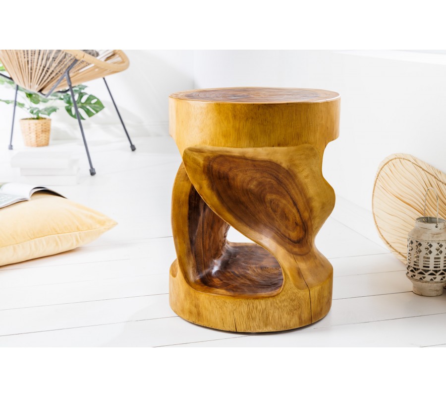 Dizajnový okrúhly príručný stolík Salian, vyrobený zexotického lakovaného dreva Suar v svetlej hnedej farbe, okamžite pritiahne pozornosť svojím unikátnym a atypickým tvarom. Jeho špecifický dizajn zahŕňa točité zakrivenie s perforovaným otvorom, ktorý vytvára nevšedný a pútavý vizuál. Tento podstavec je tak nielen praktickým prvkom, ale aj umením samotným.