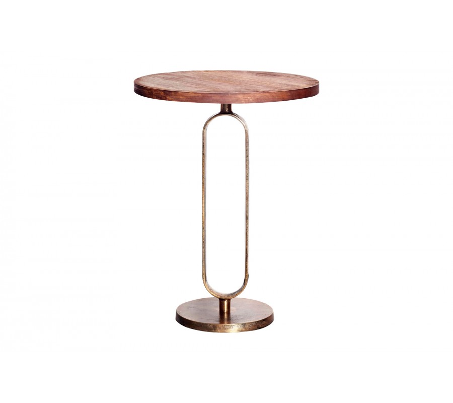 Stolík má okrúhlu drevenú dosku s hlakým povrchom s opotrebovaným dizajnom čo dodáva stolíku vintage nádych. Doska je na okrajoch tmavšej hnedej farby a na vrchu je zámerne vyblednutá. Konštrukcia sa skladá z nohy stolíka a podstavy. Noha je oválneho tvaru pričom jej zaujímavosťou je perforovanie čo je jedinečný detail tohto stola. Je medenej farby, na ktorej sa nachádza čierna patina a jej leský povrch podčiarkuje typickosť pre glamour štýl. Podstava je rovnakej medenej farby v okrúhlom tvare, ktorá poskytuje stolíku pevnú oporu.
