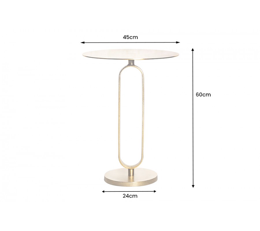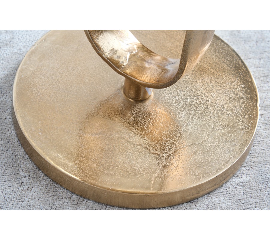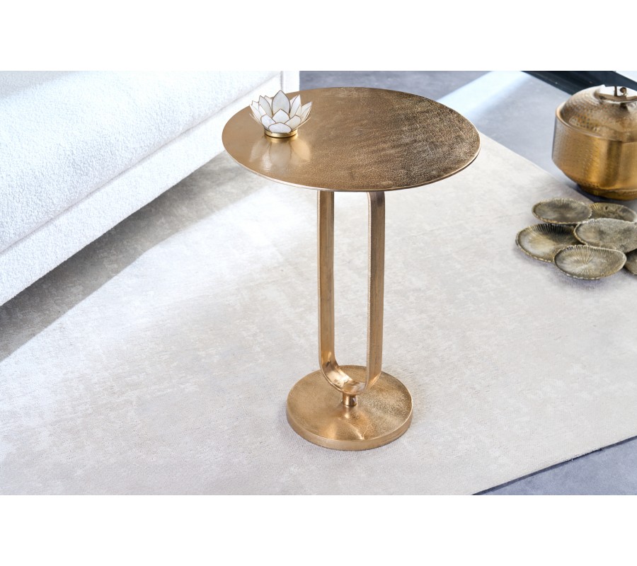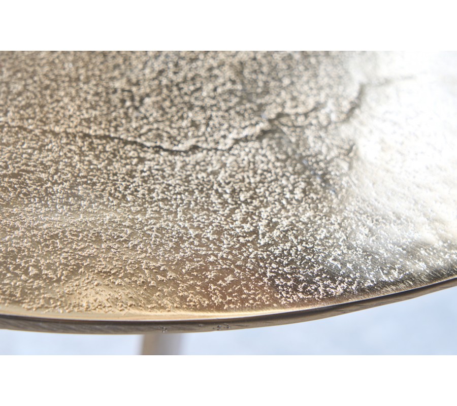 Stolík je zlatej farby vyrobený zozliatiny a hliníka, ktorý pôsobí ako odliatok z kovu. V svetlejšom osvetlení zlatá farba odráža odlesky čo je typické pre glamour štýl.