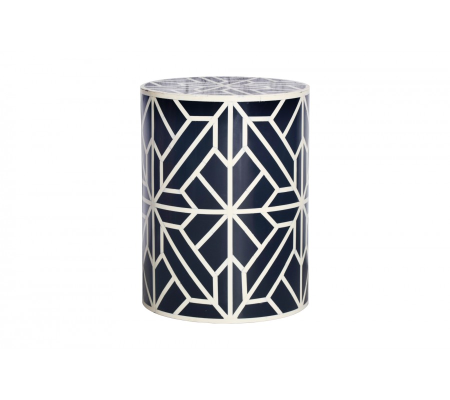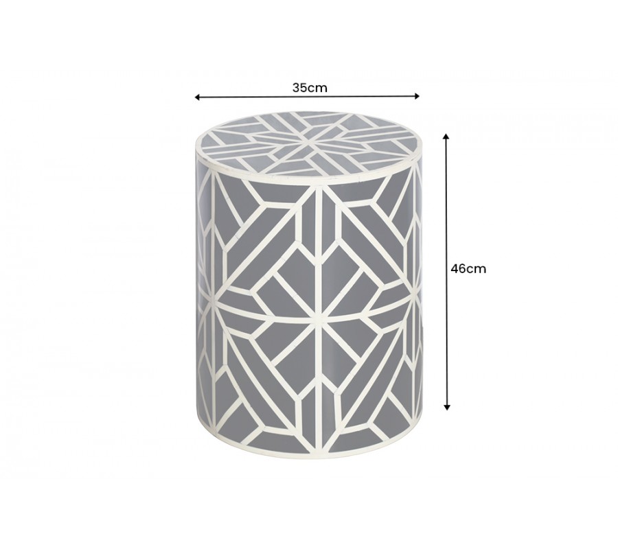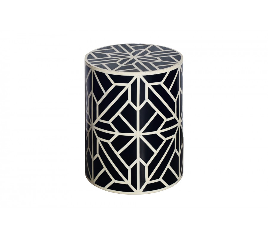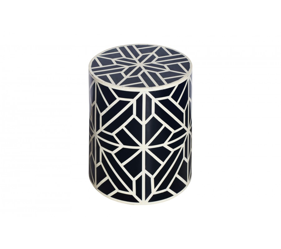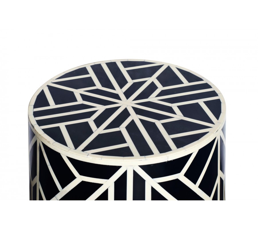 Biela farba gemetrického vzorovania na stolíku, ktorá pripomína kvety, vyniká ešte viac na kontrastnom čiernom pozadí. Tento vzor dodáva stolíku dynamický a moderný vzhľad, ktorý je ideálny pre interiéry zariadené v modernom a art deco štýle. Jedná sa o techniku bone inlay čo znamená, že ide o ručné vkladanie byvolej kosti do nábytku.