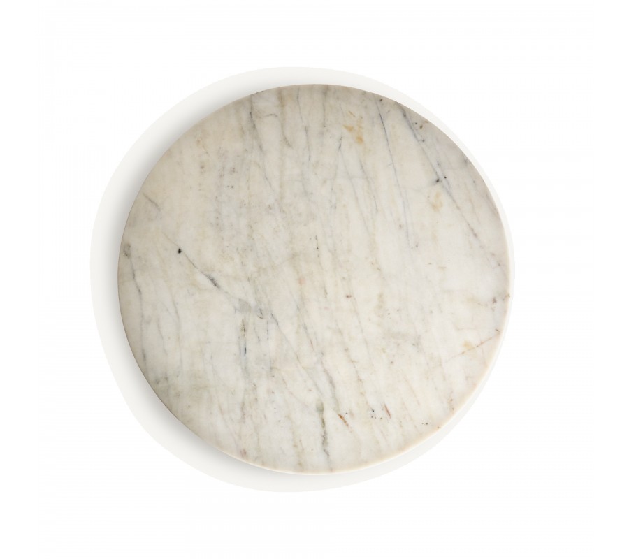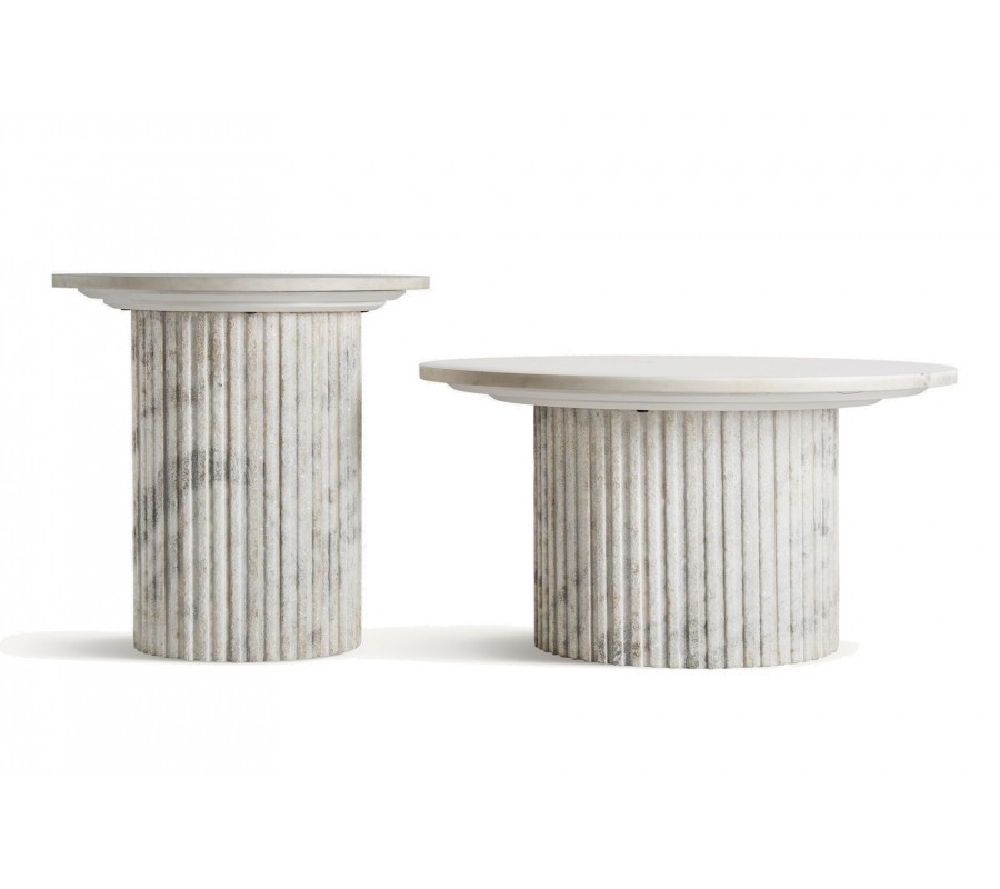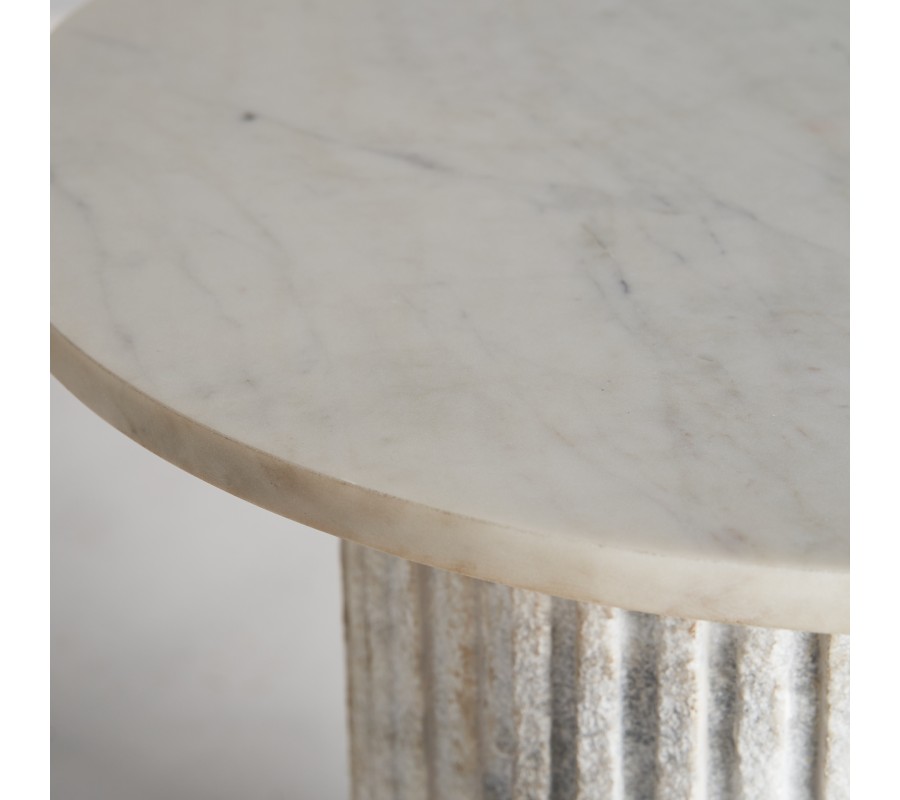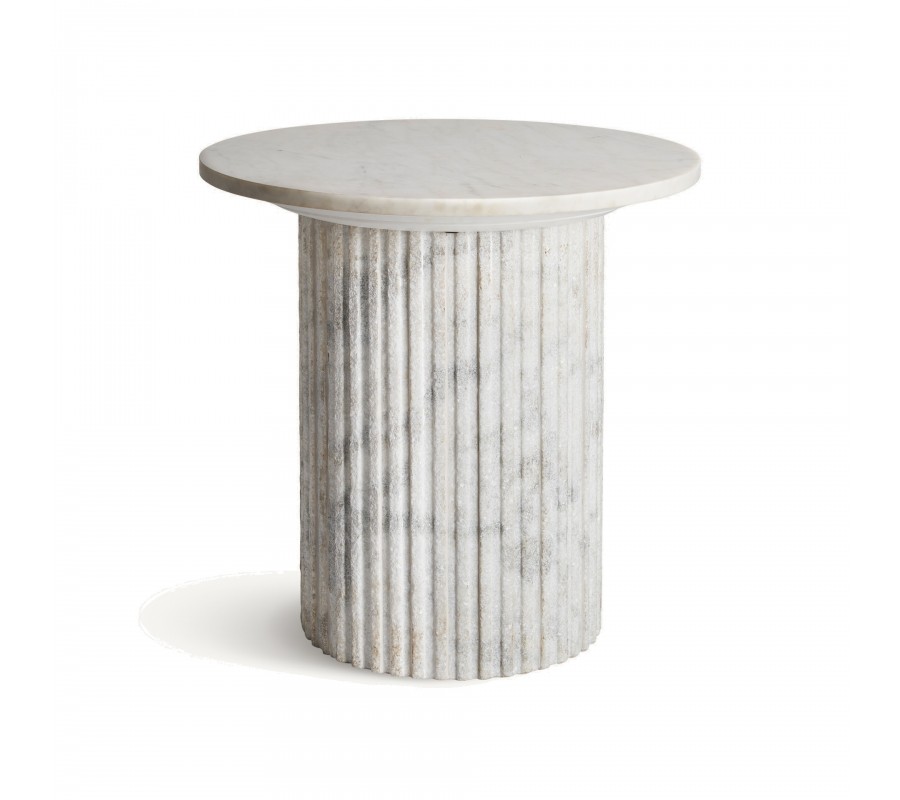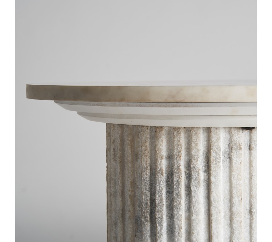 Silueta stolíka svojím tvarom pripomína antický stĺp. Vrchnú časť tvorí okrúhla doska, uložená na mohutnej nohe s vertikálnym drážkovaným reliéfom, ktorý pripomína kanelúry na antických stĺpoch. Povrch nohy je drsnejší, v kontraste s lesklou hladkou vrchnou doskou. Stolík je vyrobený z bieleho mramoru s prirodzenou sivou kresbou kameňa s teplými béžovými podtónmi. Materiál tak pôsobí naturálnym dojmom.