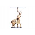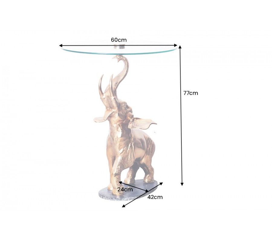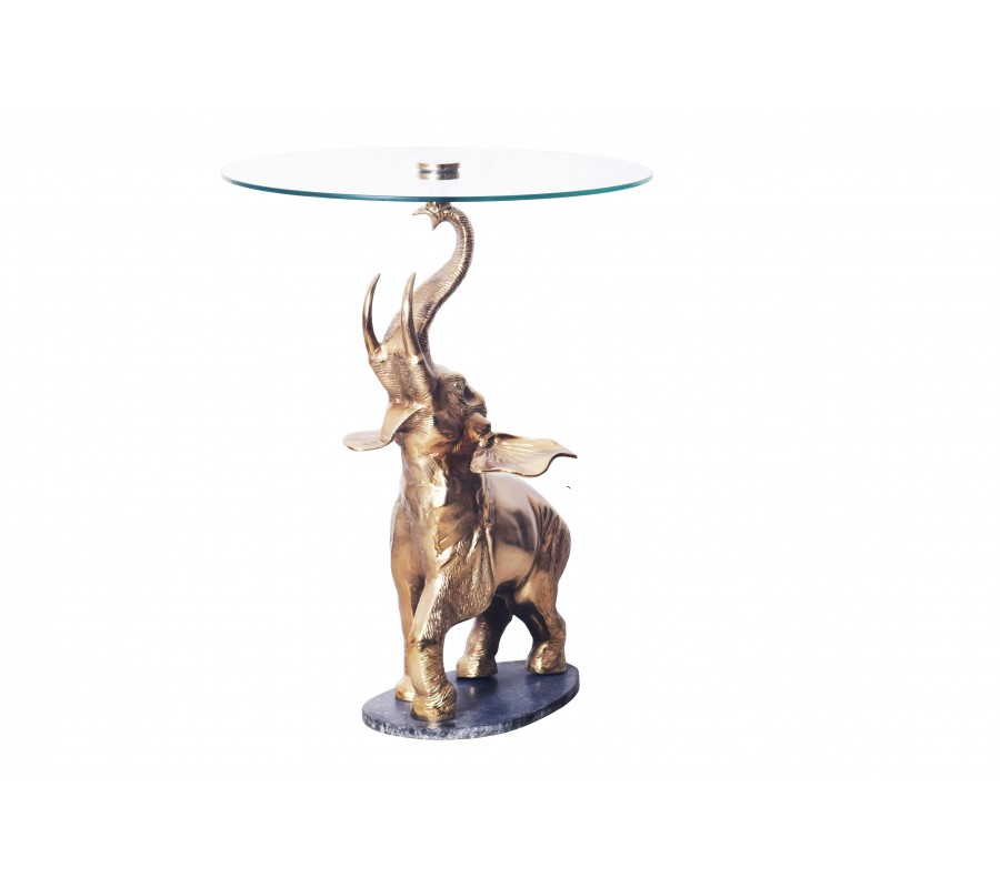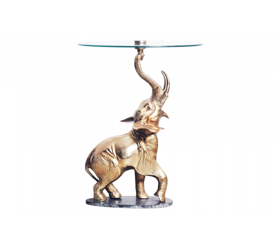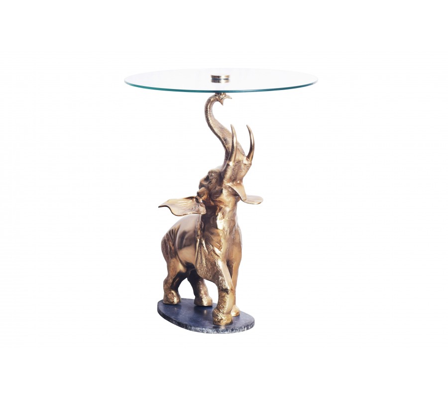 Dizajnový zlatý glamour príručný stolík Balarama s figúrou slona a sklenenou vrchnou doskou 75 cm