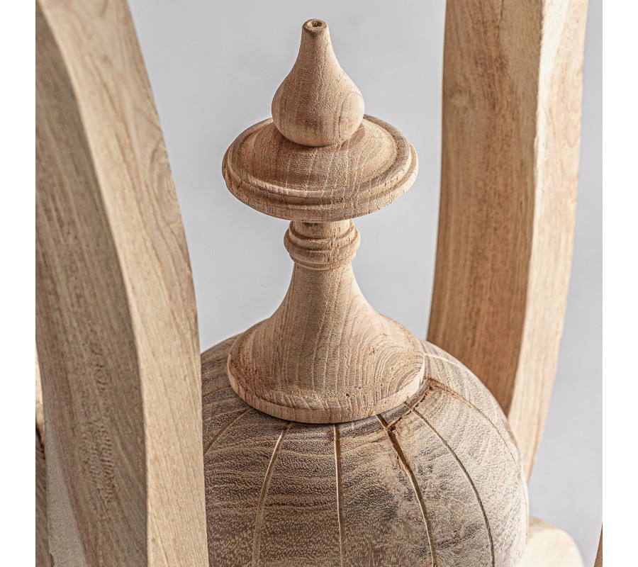 Vrchná doska je položená na štyroch elegantných zakrivených nožičkách, ktoré sa pripájajú k centrálnemu prvku podstavy. Ten tvorí srdce stolíka. Má valcovitý tvar, na vrchole ukončený pologuľou, ktorú zdobí vyrezávaný lineárny reliéf. Z jej stredu sa do priestoru týči vyrezávaný vrcholec so štíhlou siluetou, ktorá sa delikátne zužuje a rozširuje. Svojím tvarom pripomína impozantnú kupolu mešity a stolíku dodáva originálny orientálny nádych.