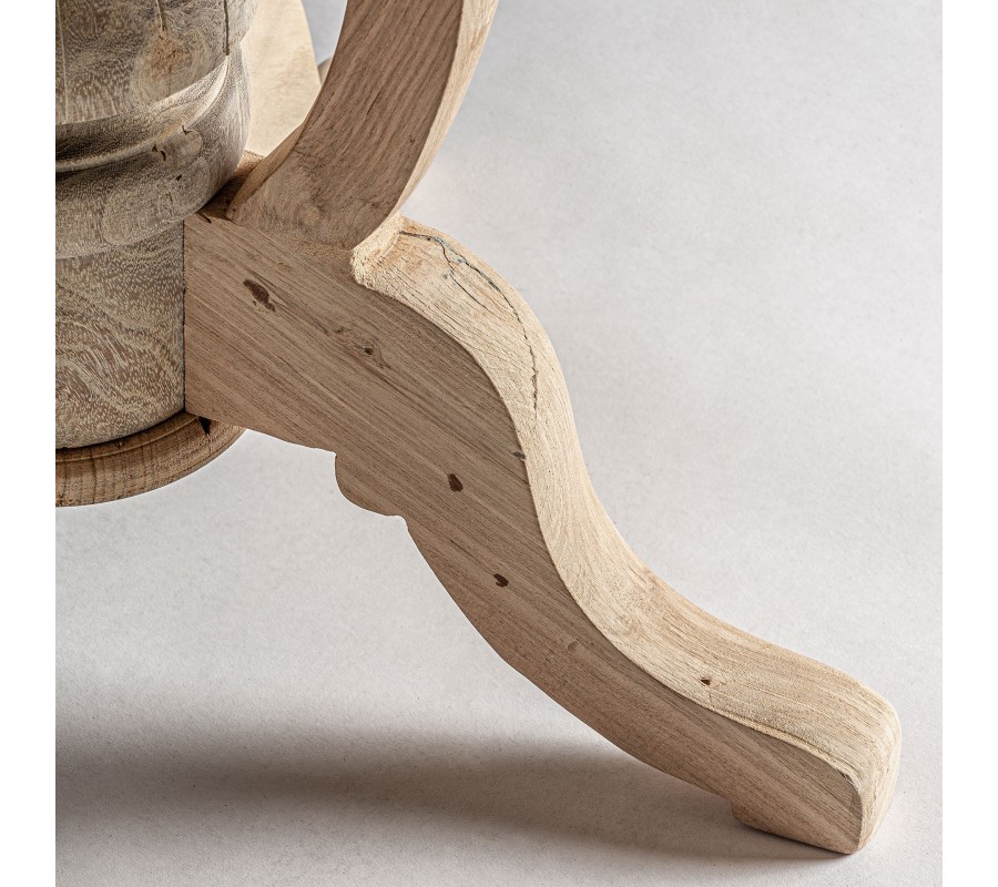 Príručný stolík vo svojom dizajne necháva vyniknúť prírodnú krásu mangového dreva v jemnej svetlej hnedej farbe. Vzor letokruhov organicky plynie po celom povrchu nábytku a prirodzené štruktúry dreva, ako napríklad rôzne pukliny, dodávajú každému kusu jedinečný charakter, ktorý môže pôsobiť až vintage dojmom.